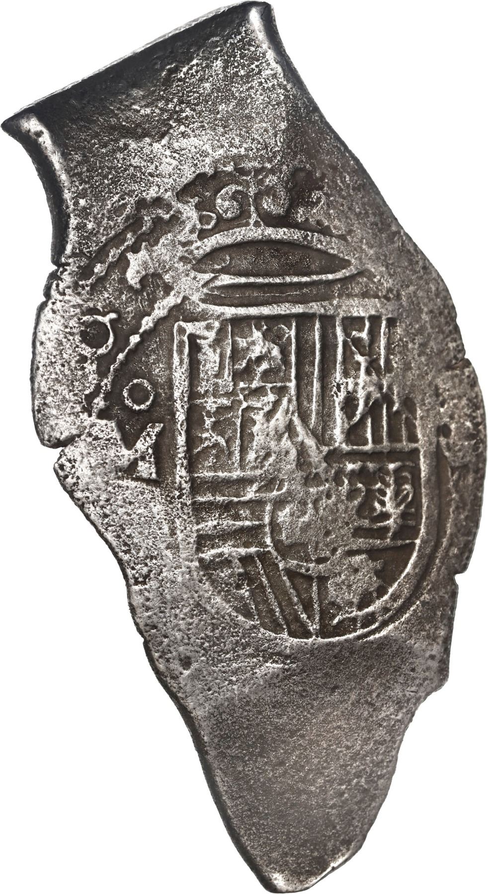 MEXICO, Mexico City, cob 8 reales, 1680 (L). S-M21; KM-46; Cal-641. 22.52 grams. Very cool "cabo de barra" shape (long and pointed) with exceptional full shield, bold oM and 0 of date above it, the cross-lions-castles also full (just a little doubled), lightly toned and minimally corroded for this wreck. Pedigreed to the Steve Valentine Collection, with original certificate from the salvor/conservator. Recovered from: Joanna, sunk in 1682 off South Africa