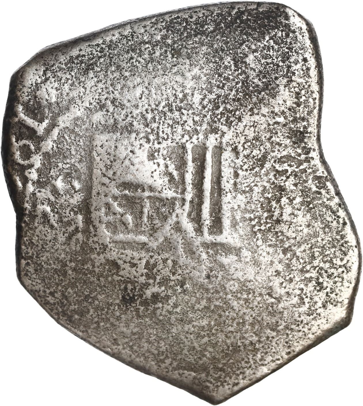 MEXICO, Mexico City, cob 8 reales, 1681 (L). S-M21; KM-46; Cal-641. 23.14 grams. Bold 81 of date, clear mintmark oM, weaker shield and cross with peripheral flatness but not overly corroded, lightly toned. Pedigreed to Sedwick Auction 16, with original lot-tag 354. Recovered from: Joanna, sunk in 1682 off South Africa