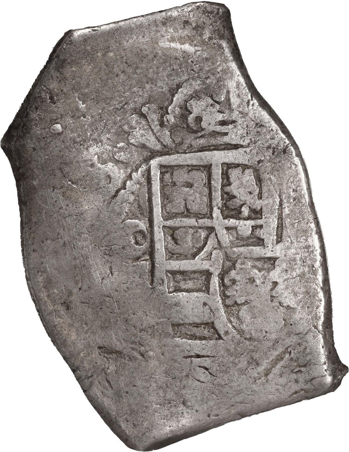 MEXICO, Mexico City, cob 8 reales, 1703 L, rare, NGC VF 20, finest and only example in NGC census. S-M21a; KM-47; Cal-1388. 27.15 grams. Typically rectangular flan with good but off-center shield enabling most of the final digit of date 3 above mintmark oM in the otherwise-flat periphery, most of cross (well centered), light natural toning all over.