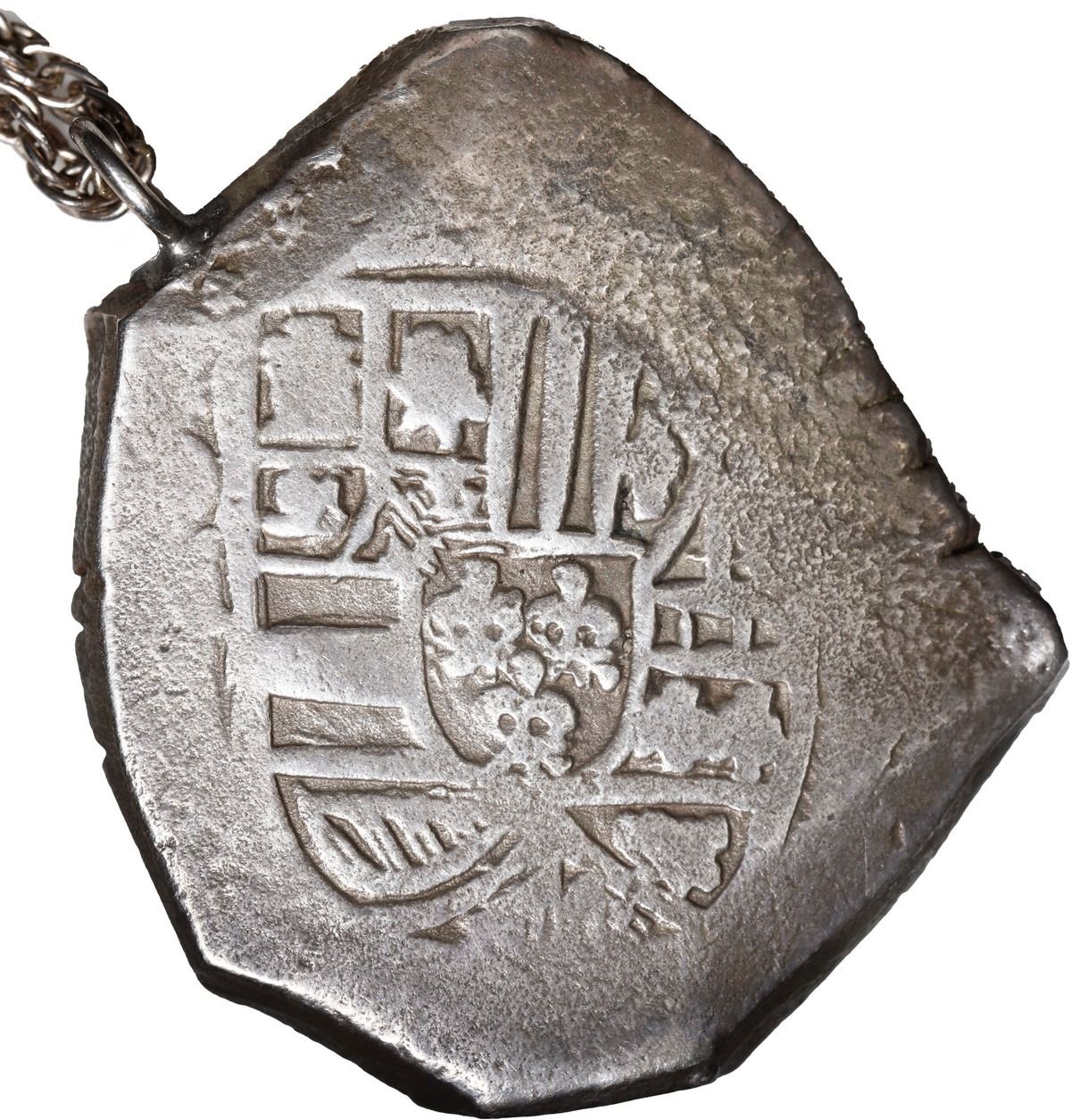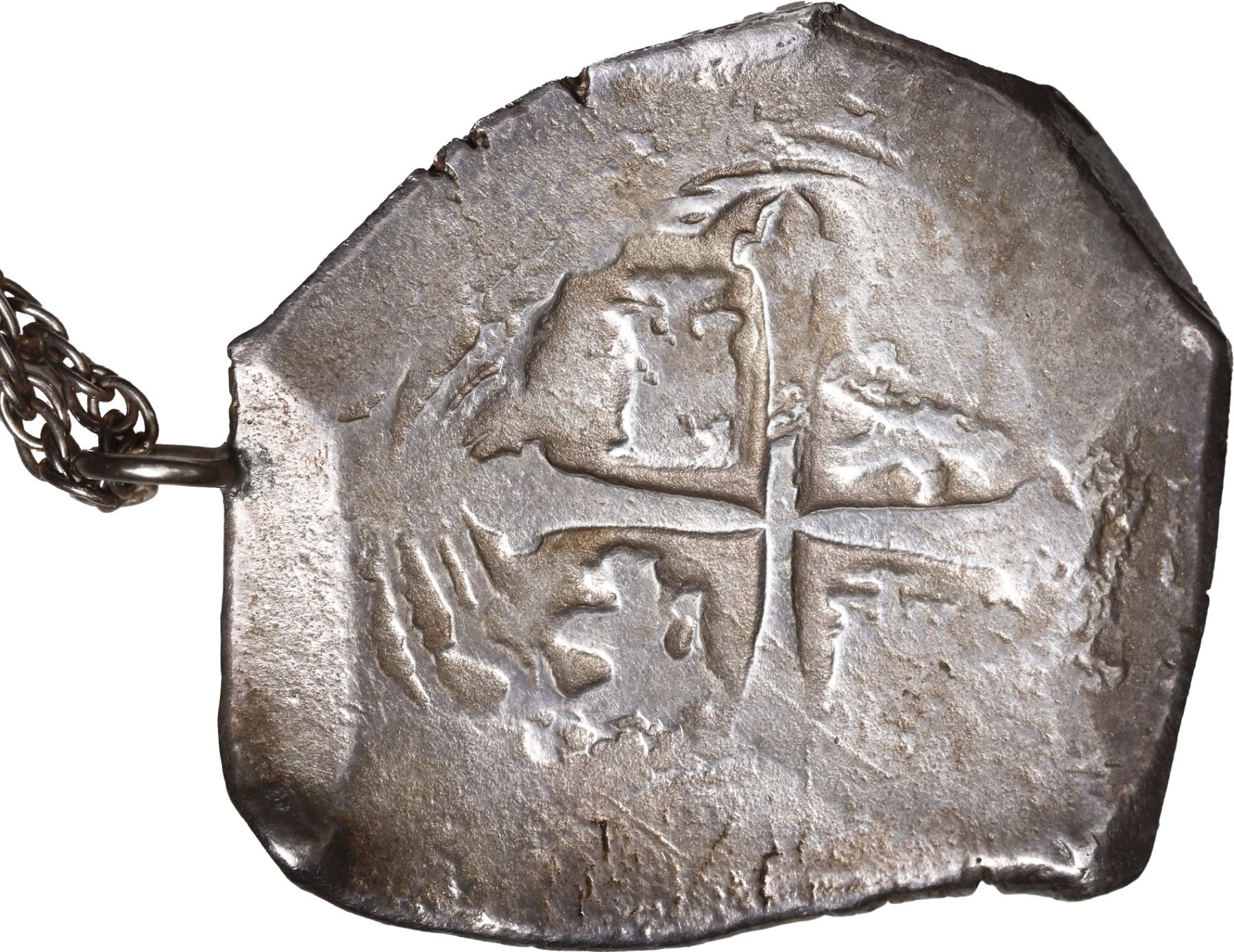 MEXICO, Mexico City, cob 8 reales, (1705-12) (J), ex-1715 Fleet, with silver loop at top of cross and silver chain. 31.43 grams total. Chain is 11½" long. Bold and nearly complete shield and cross with only a little corrosion along the edge. From the 1715 Fleet, with small certificate from 1977.