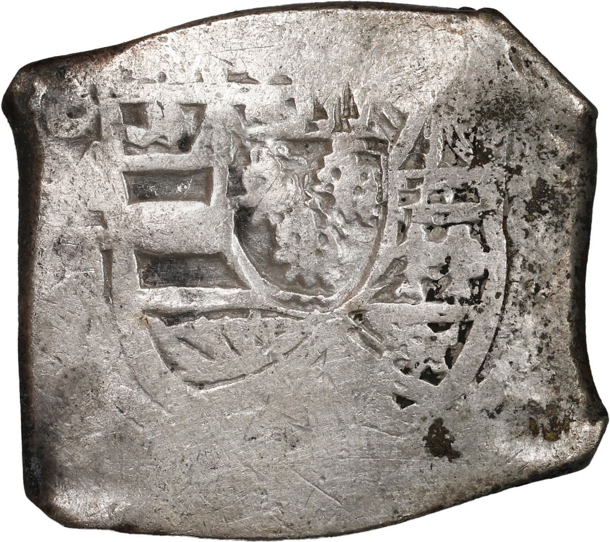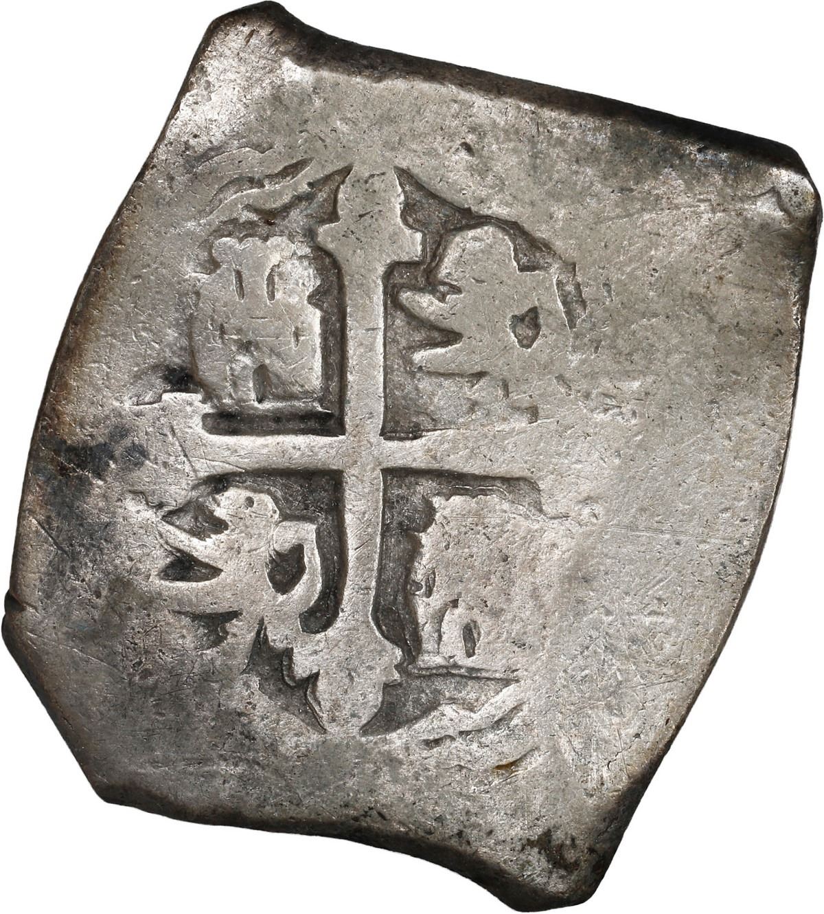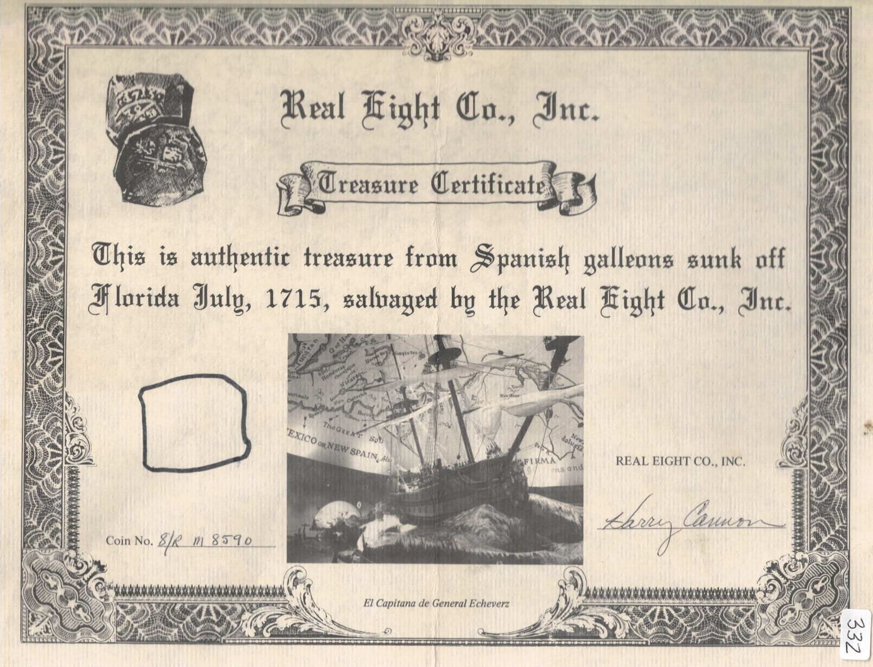 MEXICO, Mexico City, cob 8 reales, (1705-12) J, ex-Real Eight. S-M22; KM-47; Cal-Type 170. 26.63 grams. Thick squarish flan with blunted points (as made), no corrosion, good full shield and cross but no peripheral details, toned in crevices, desirable original paperwork. With original Real Eight Co. holder and certificate M8590 signed by Harry Cannon, also with original 1975 receipt for purchase from Real Eight's Museum of Sunken Treasure in Cape Canaveral. Recovered from: Spanish 1715 Fleet, sunk off the east coast of Florida