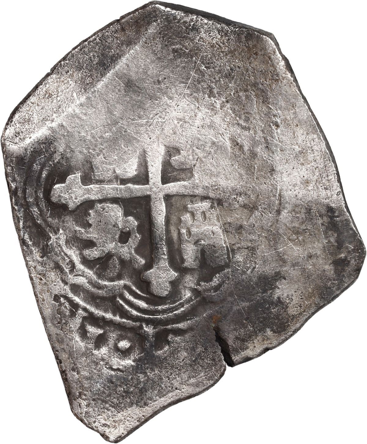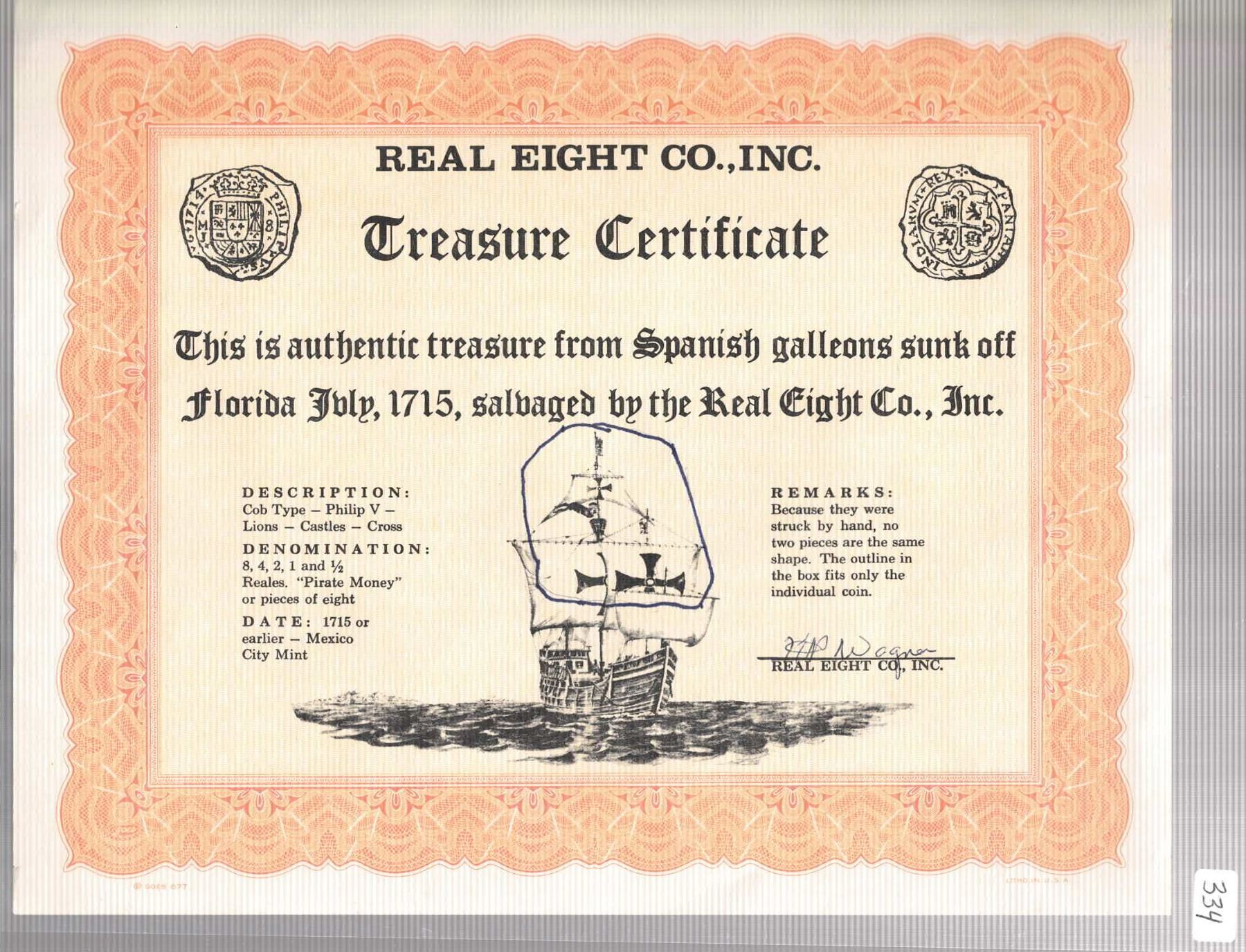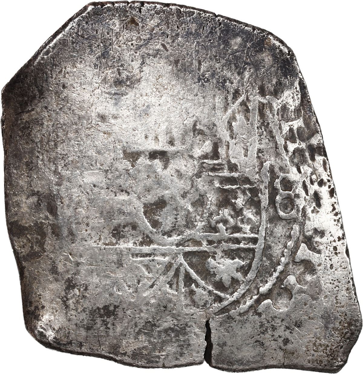 MEXICO, Mexico City, cob 8 reales, (1705-12) (J), ex-Wagner. S-M22; KM-47; Cal-Type 170. 25.56 grams. Very broad flan with practically no corrosion but much flatness, the cross and shield still nearly full and with bold denomination and most of king's name PHILIPPVS visible, hairline edge-split, patches of toning, desirable original certification. With original Real Eight Co. certificate hand-signed by Kip Wagner. Recovered from: Spanish 1715 Fleet, sunk off the east coast of Florida