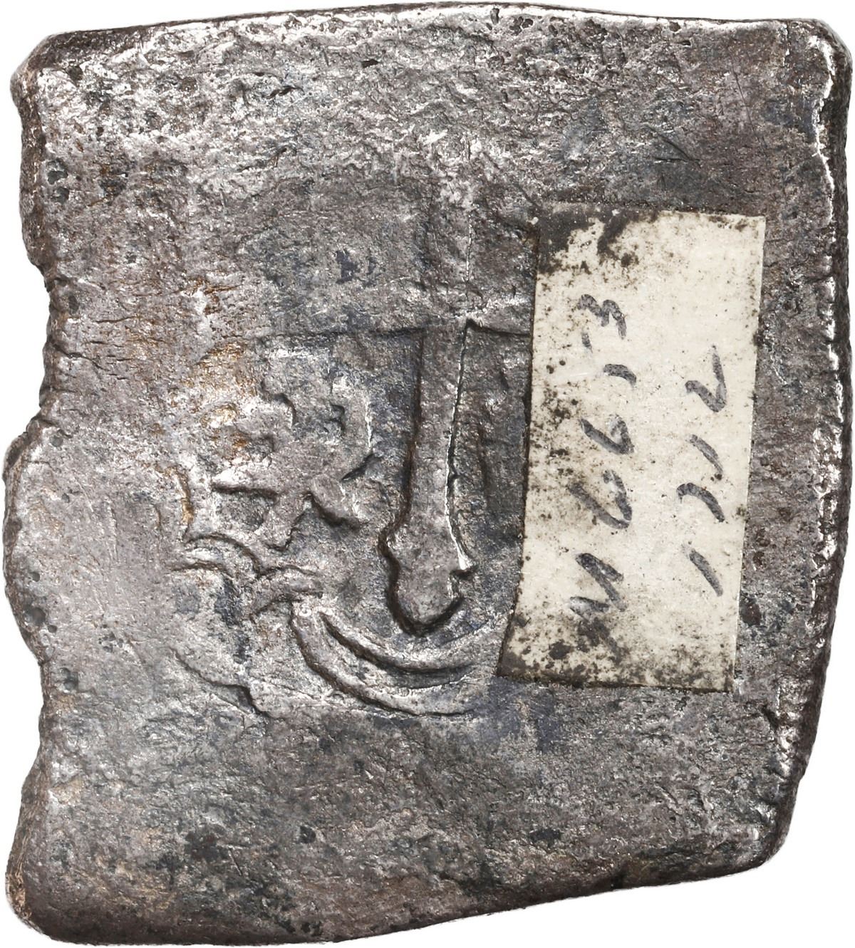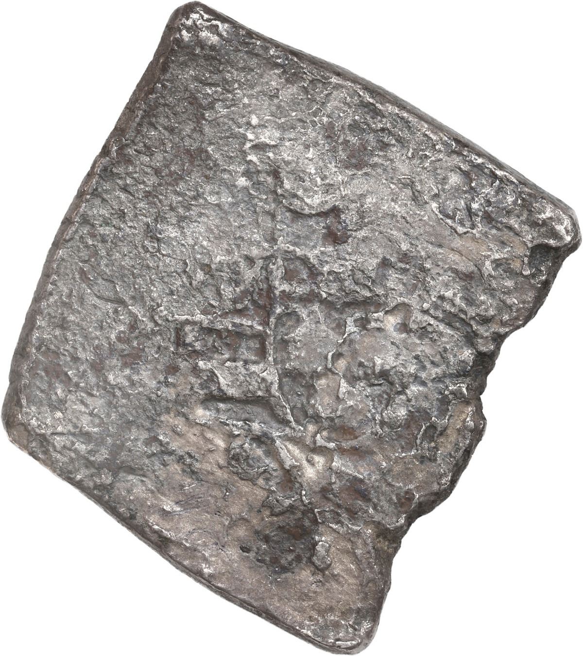 MEXICO, Mexico City, cob 8 reales, (1712-14) (J). S-M22; KM-47; Cal-Type 170. 23.92 grams. Squarish flan with heavily corroded shield (mostly full), decent cross with sticker on that side, mostly darkly toned. With museum sticker M6613. Recovered from: Spanish 1715 Fleet, sunk off the east coast of Florida