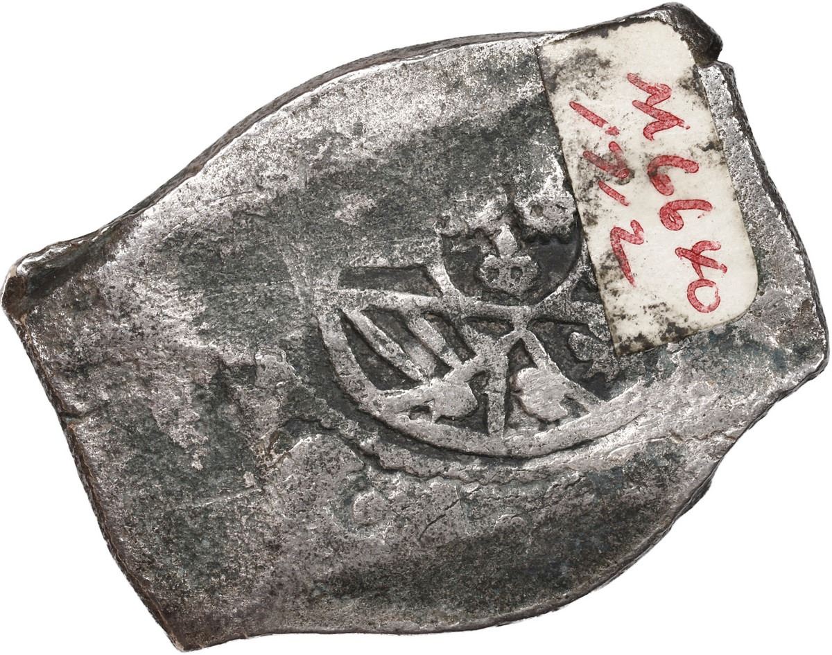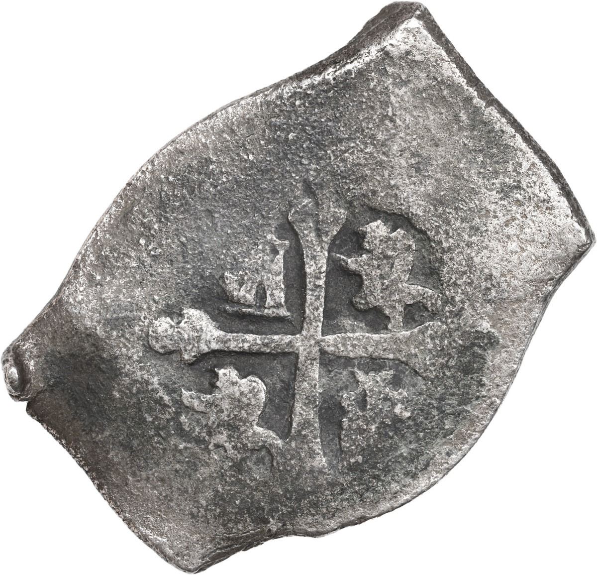 MEXICO, Mexico City, cob 8 reales, (1712-14) (J). S-M22; KM-47; Cal-Type 170. 24.10 grams. Distinctly barrel-shaped flan with good full cross, off-center shield with sticker on right side, light surface corrosion, patchy toning. With museum sticker M6640. Recovered from: Spanish 1715 Fleet, sunk off the east coast of Florida