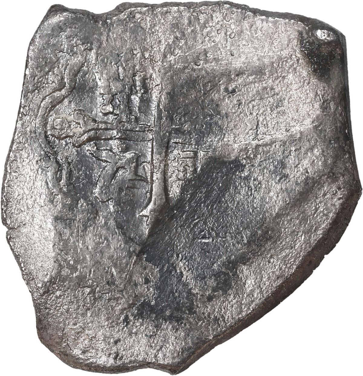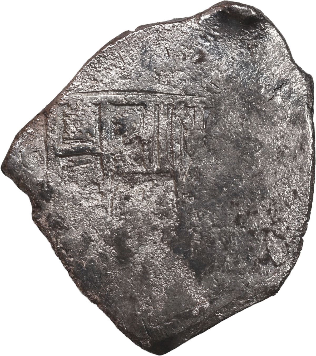 MEXICO, Mexico City, cob 8 reales, (1712-14) (J). S-M22; KM-47; Cal-Type 170. 24.25 grams. Broad flan with flat peripheries but some cross and shield remaining despite light to moderate surface corrosion, slightly silvery. Recovered from: Spanish 1715 Fleet, sunk off the east coast of Florida