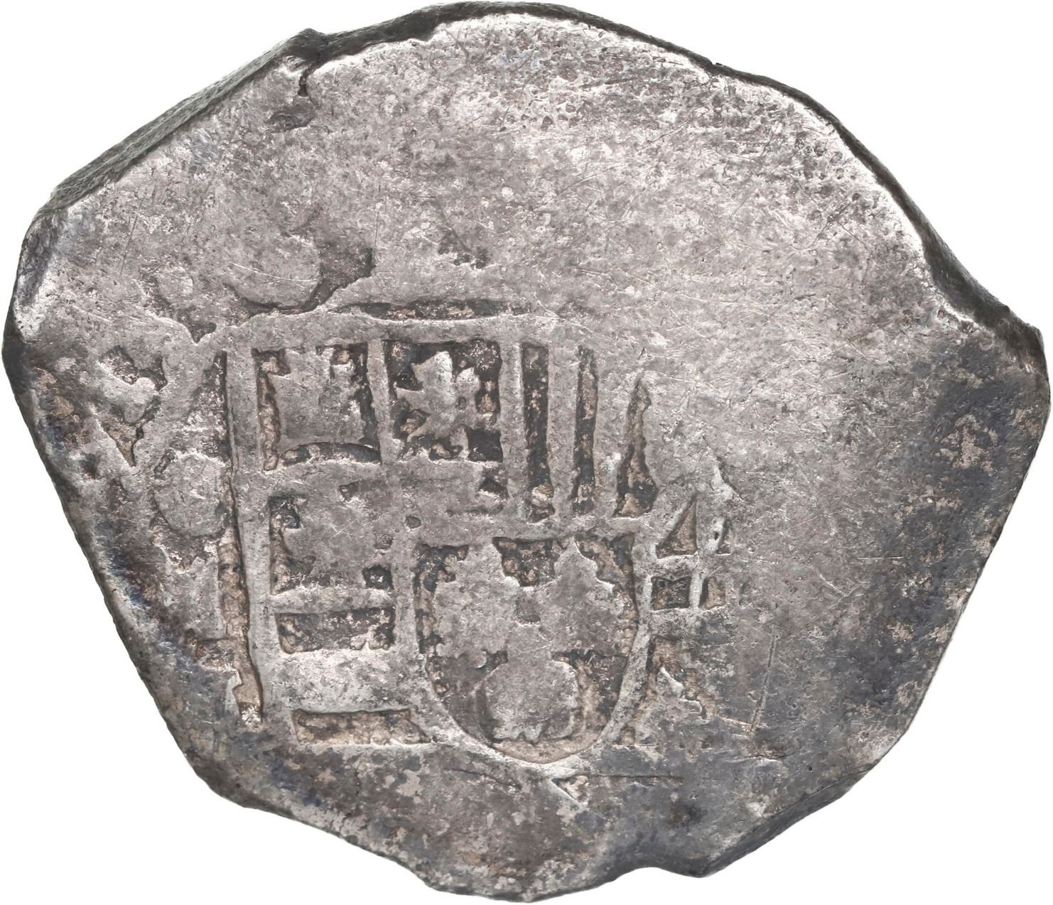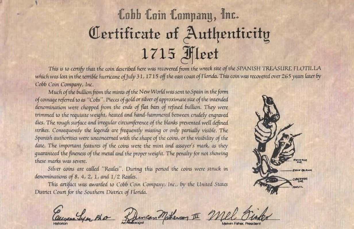 MEXICO, Mexico City, cob 8 reales, 1713 J. S-M22; KM-47; Cal-1400. 26.76 grams. Broad flan with good full cross and nearly full shield, most of date and oMJ, minimal surface corrosion but some dark oxidation and toning. With (generic) Cobb Coin Co (Fisher) certificate. Recovered from: Spanish 1715 Fleet, sunk off the east coast of Florida