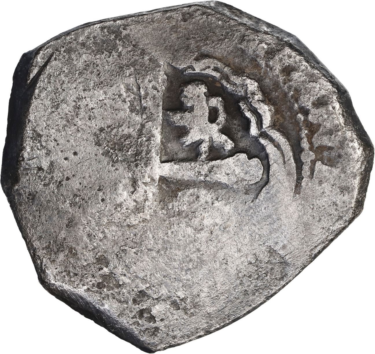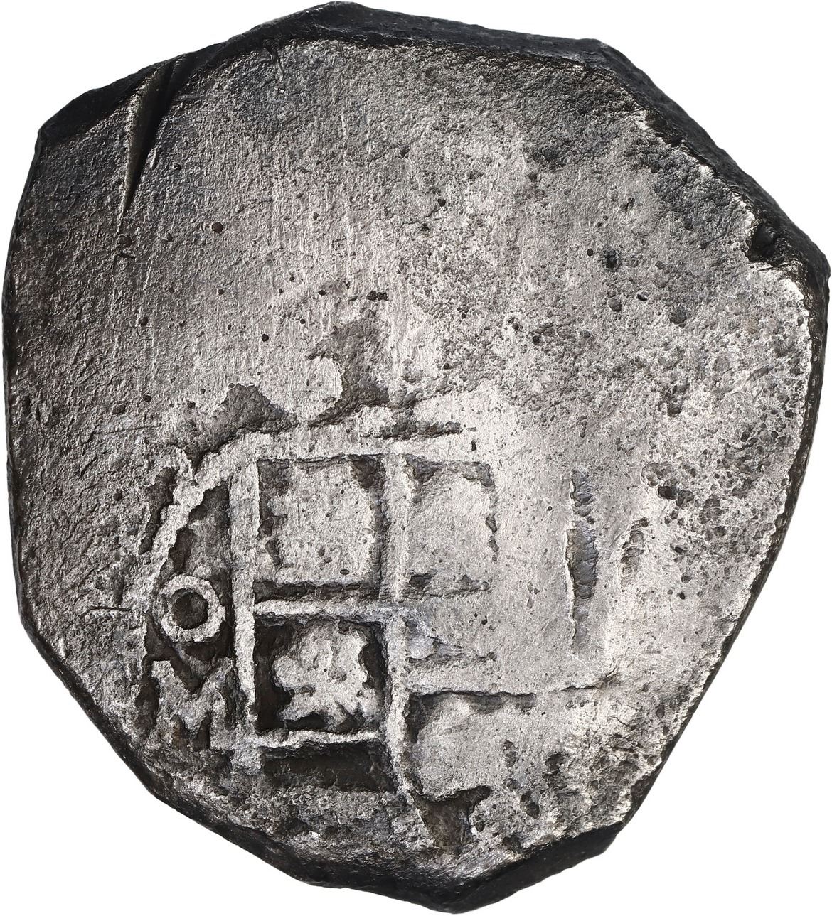MEXICO, Mexico City, cob 8 reales, 1713 (J). S-M22; KM-47; Cal-1400. 24.99 grams. Solid flan with minimal corrosion but much flatness, just one lion visible on cross side, the shield also incomplete (off-center) but with bold mintmark oM and clear bottom of 3 in legend above that, lightly toned. With photo-certificate. Recovered from: Spanish 1715 Fleet, sunk off the east coast of Florida