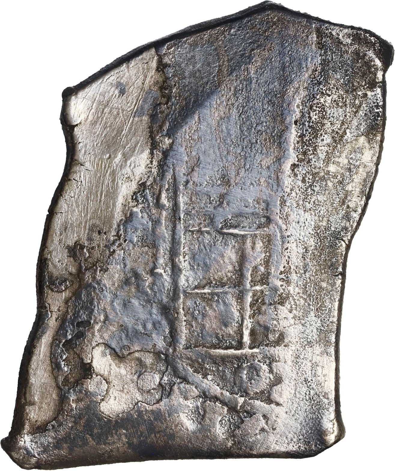 MEXICO, Mexico City, cob 8 reales, 1713 (J). S-M22; KM-47; Cal-1400. 26.53 grams. Neat shape (leaning rectangle) with clear 713 of date and mintmark oM to left of partial shield, the cross nearly full despite typical flatness and corrosion, uneven toning. Recovered from: Spanish 1715 Fleet, sunk off the east coast of Florida