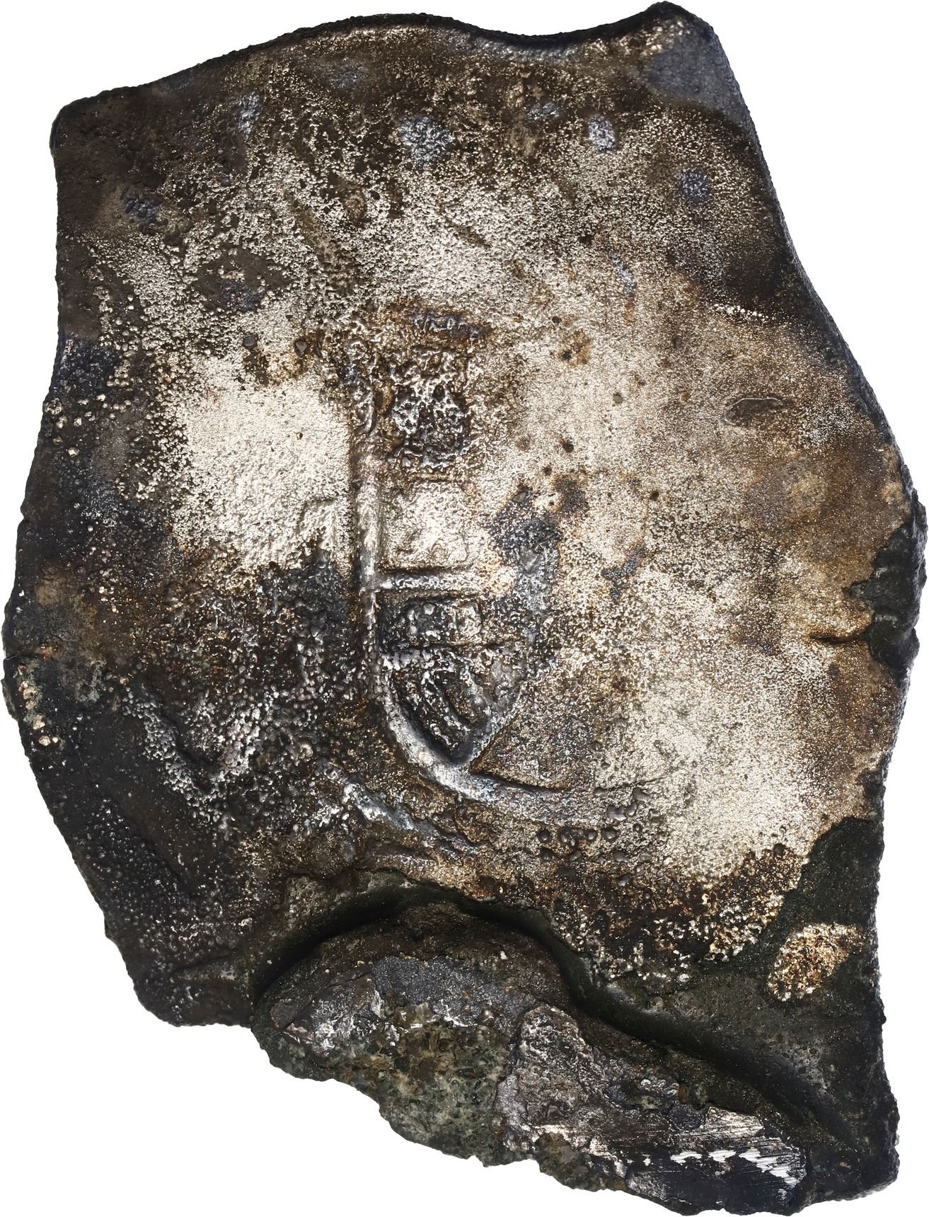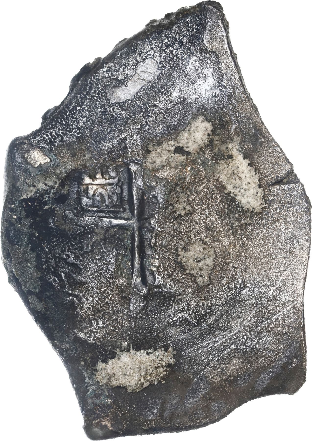 MEXICO, Mexico City, cob 8 reales, (1714) (J), new-style shield, old-style cross, encrusted with fragment of another coin (as found). S-M22; KM-47; Cal-1401. 28.49 grams total. Large flan with four points, much peripheral flatness but good inner details, the cross well centered but the shield shifted up and right, patchy toning with some surface corrosion among patches of white and brown encrustation in addition to the silver fragment adhering below the shield, pretty neat. Recovered from: Spanish 1715 Fleet, sunk off the east coast of Florida