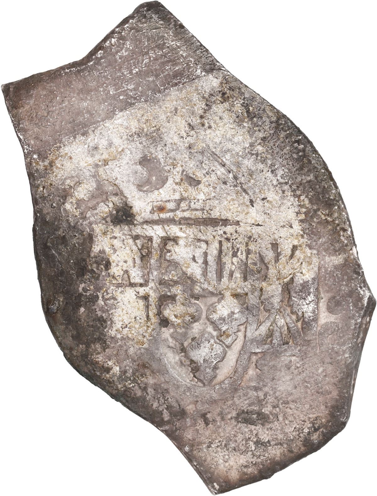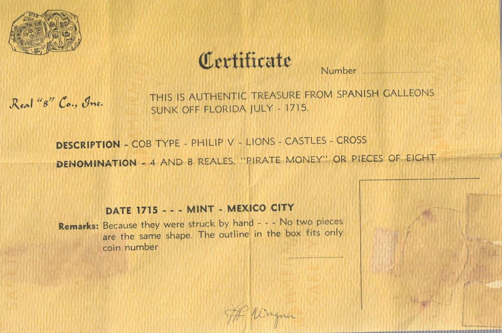 MEXICO, Mexico City, cob 8 reales, 1714 (J), new-style shield, old-style cross, ex-Kip Wagner. S-M22; KM-47; Cal-1401. 23.63 grams. Urn-shaped flan with most of shield and crown, full 4 of date, the cross side a bit corroded and encrusted (uncleaned) but solid overall, mostly toned, desirable original provenance. With original Real Eight Co. certificate hand-signed by Kip Wagner. Recovered from: Spanish 1715 Fleet, sunk off the east coast of Florida