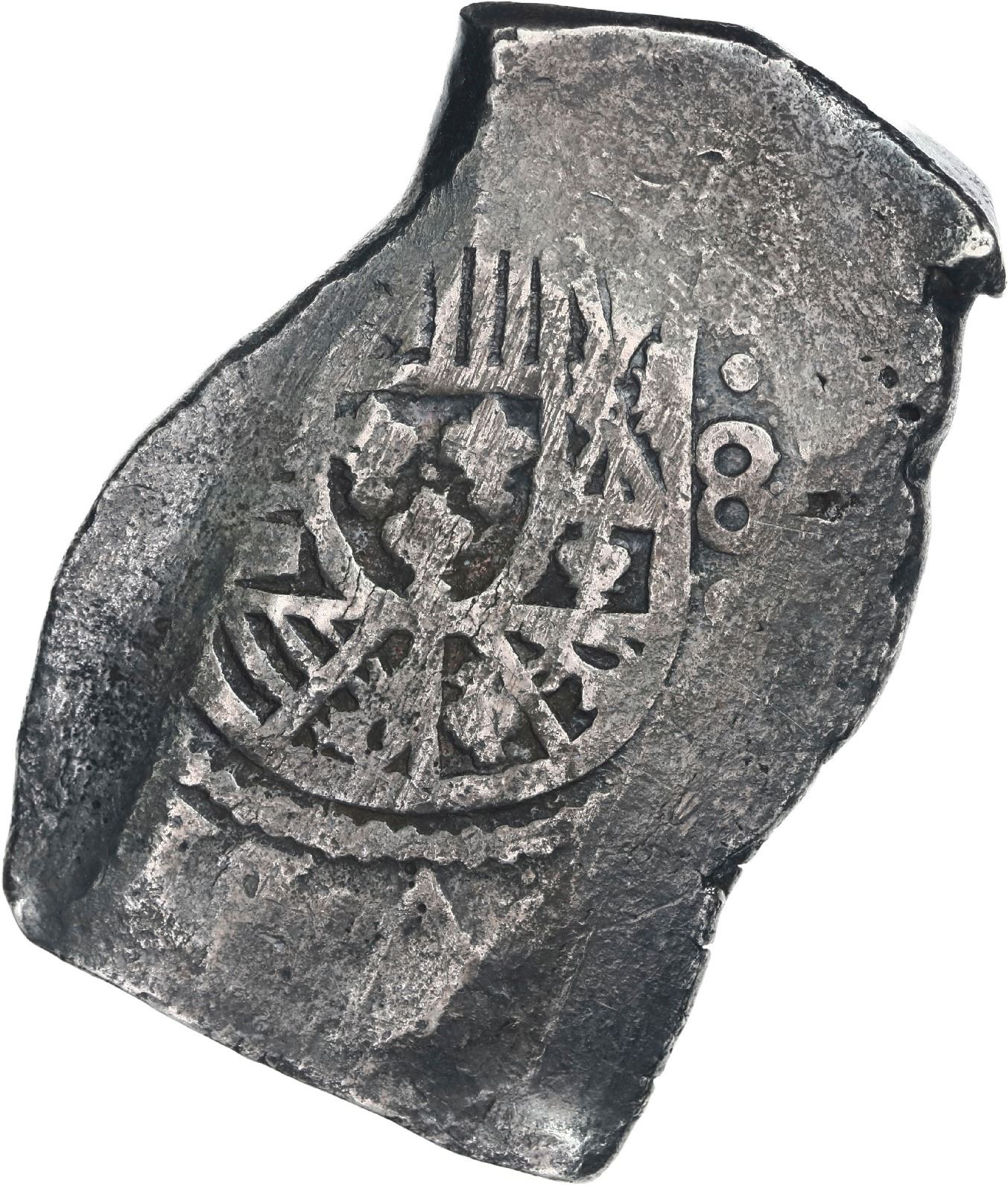 MEXICO, Mexico City, cob 8 reales, (1714) (J), new style shield, old style cross. S-M22; KM-47; Cal-1401. 25.27 grams. Very deeply toned and corrosion-free, with good full cross and nearly full shield with bold 8 to right, peripheries flat except for king's ordinal V in legend, non-round flan. With Cobb Coin Co (Fisher) certificate 1715-200008 from 1986. Recovered from: Spanish 1715 Fleet, sunk off the east coast of Florida