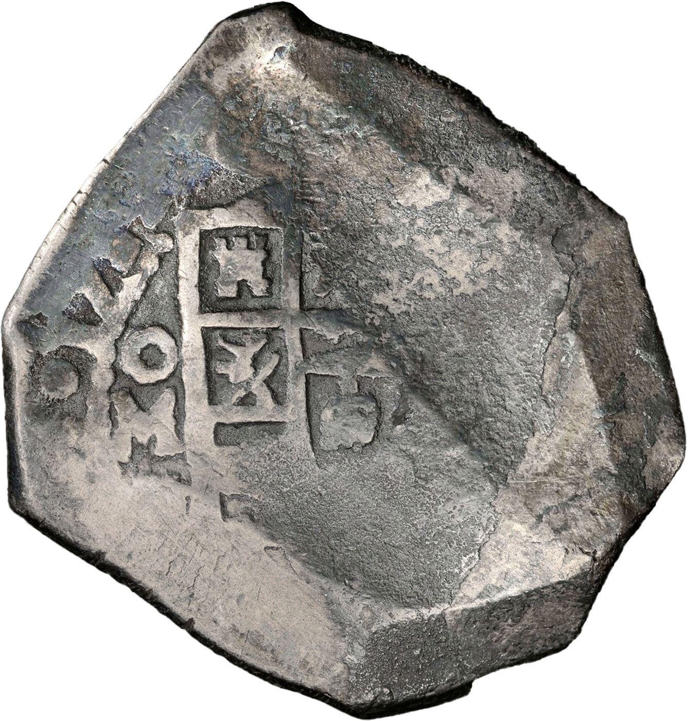 MEXICO, Mexico City, cob 8 reales, 1714 J, old-style shield and cross, PCGS F details / saltwater damage (1715 Fleet). S-M22; KM-47; Cal-1401. 25.90 grams. Bottom half of date above bold mintmark oM, some shield and cross but mostly flat, unevenly toned, minimal corrosion, extra-thick slab. Recovered from: Spanish 1715 Fleet, sunk off the east coast of Florida