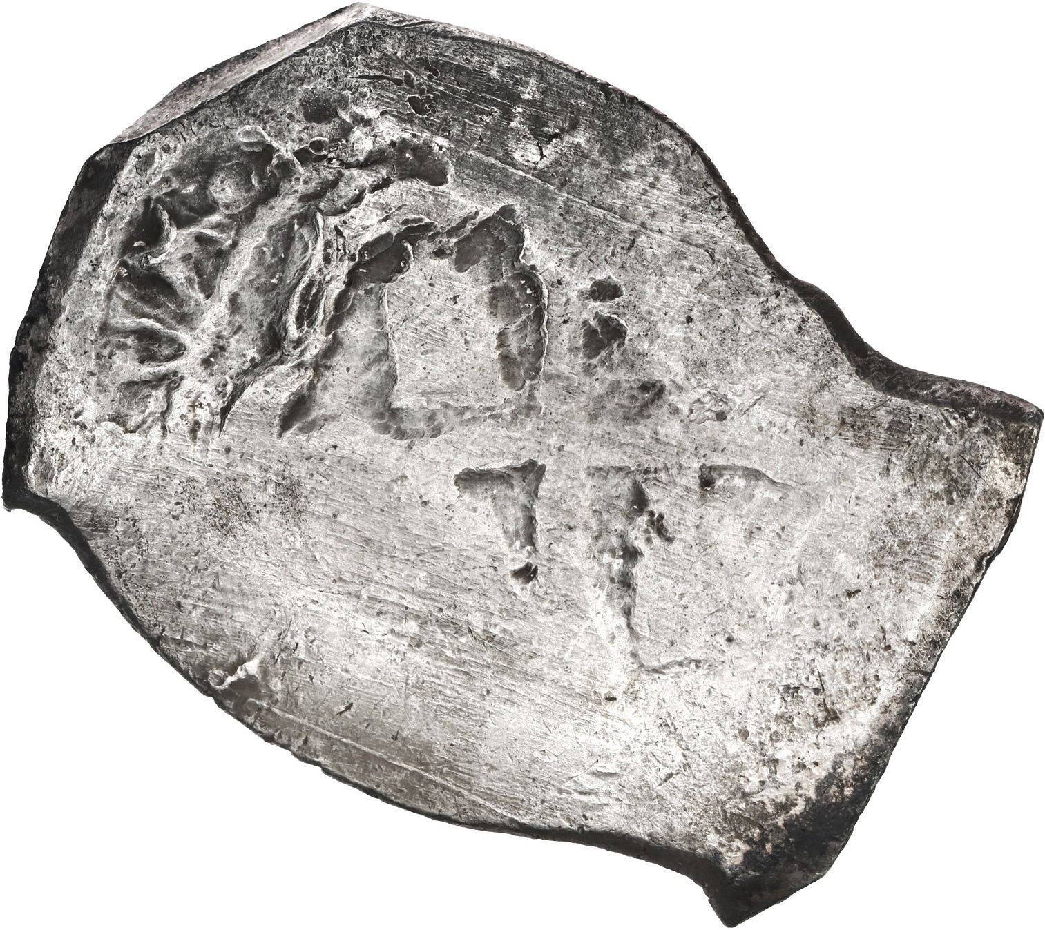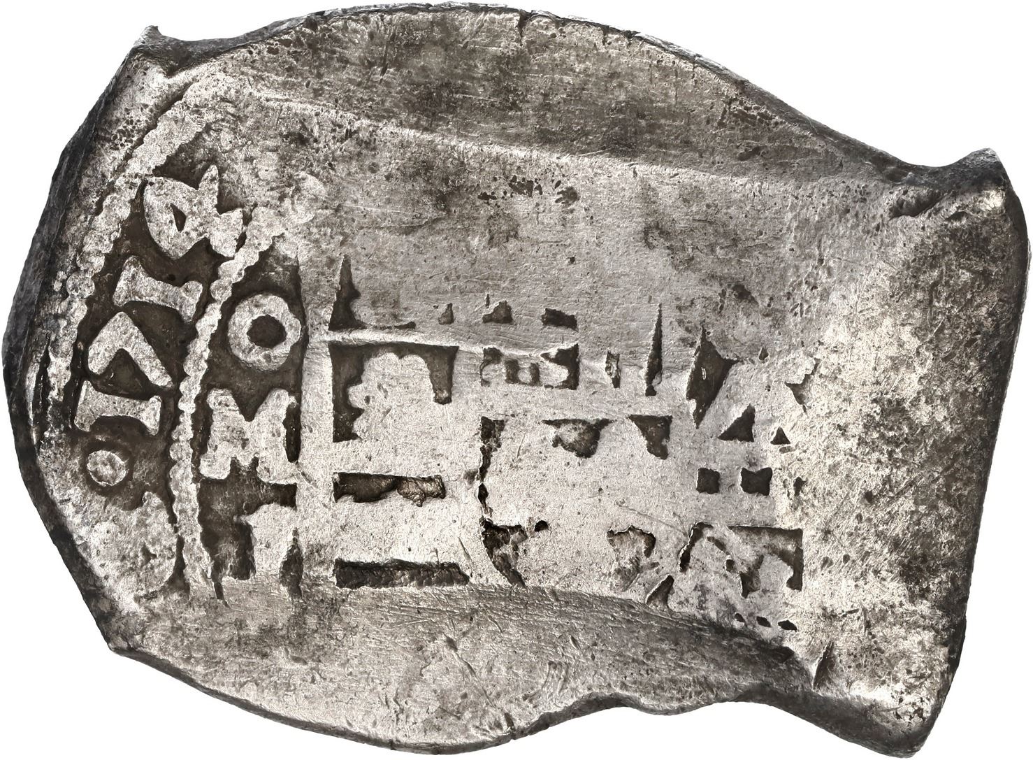 MEXICO, Mexico City, cob 8 reales, 1714 J, old-style shield and cross. S-M22; KM-47; Cal-1401. 25.58 grams. Oblong flan with very bold full date and oMJ, most of cross and shield (both weakly struck), practically no corrosion, faint toning in crevices. With NGC 1715 Fleet Shipwreck Label (VF details). Recovered from: Spanish 1715 Fleet, sunk off the east coast of Florida