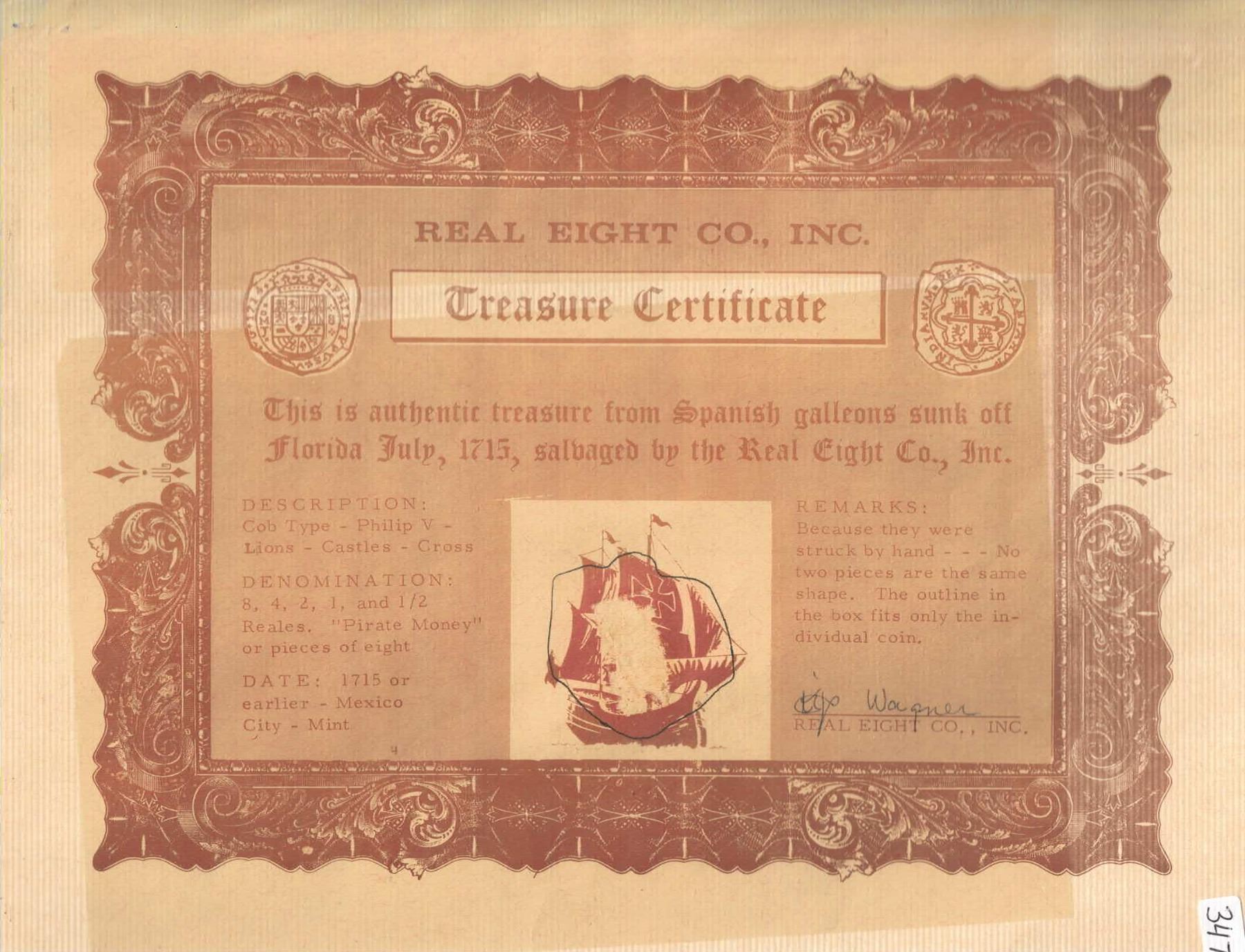 MEXICO, Mexico City, cob 8 reales, (1714) (J), small shield variety, ex-Wagner. S-M22; KM-47; Cal-1401. 25.92 grams. Very broad, odd-shaped flan with choice full shield and full but partially flat cross (both well centered), partial date despite flat peripheries, curiously toned around rectangular center of shield where protected, desirable original provenance. With original Real Eight Co. certificate hand-signed by Kip Wagner. Recovered from: Spanish 1715 Fleet, sunk off the east coast of Florida