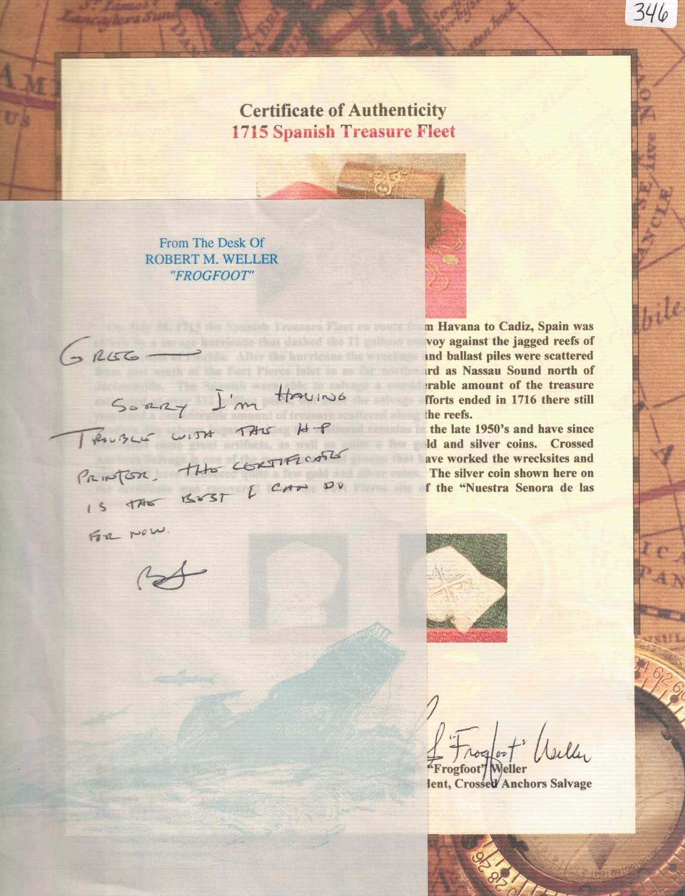 MEXICO, Mexico City, cob 8 reales, 1714 (J), small shield variety, ex-Weller. S-M22; KM-47; Cal-1401. 22.52 grams. Nearly full date, crown, shield, and mintmark but that side all a bit corroded, the cross very full and bold, with spots of dark toning, interesting shape. With original photo-certificate and letter hand-signed by Bob "Frogfoot" Weller that says "Sorry I'm having trouble with the H-P printer. The certificate is the best I can do for now." Recovered from: Spanish 1715 Fleet, sunk off the east coast of Florida