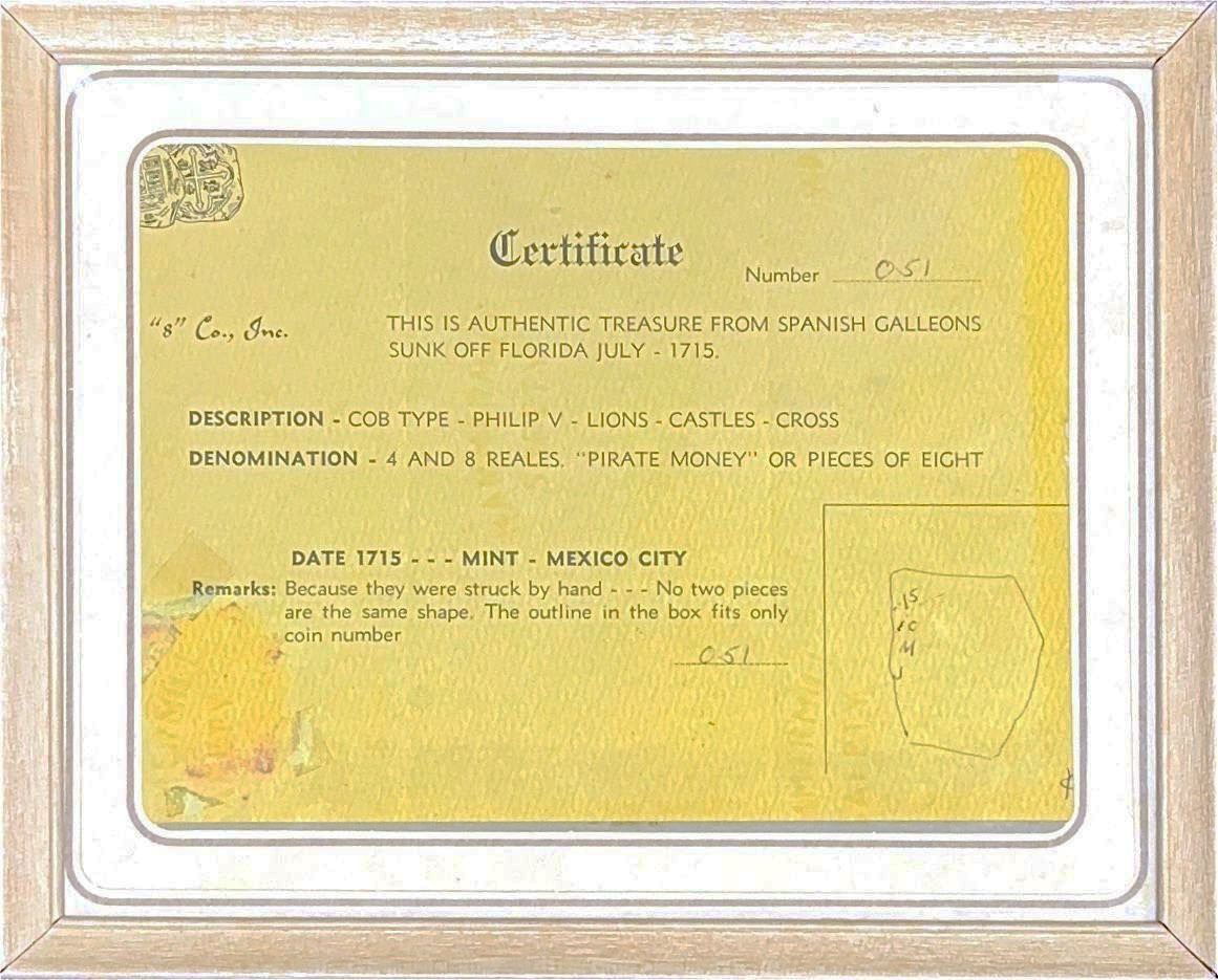 MEXICO, Mexico City, cob 8 reales, 1715 J, ex-Real Eight (Wagner). S-M22; KM-47; Cal-1402. 24.92 grams. Clear 15 of date above full oMJ to left of well-detailed shield (nearly full), choice cross (also nearly full), light surface corrosion in places, nicely toned. With original Real Eight Co. certificate hand-initialed by Kip Wagner in its original metal-and-glass frame (wood design) housed in a custom burgundy felt bag. Recovered from: Spanish 1715 Fleet, sunk off the east coast of Florida