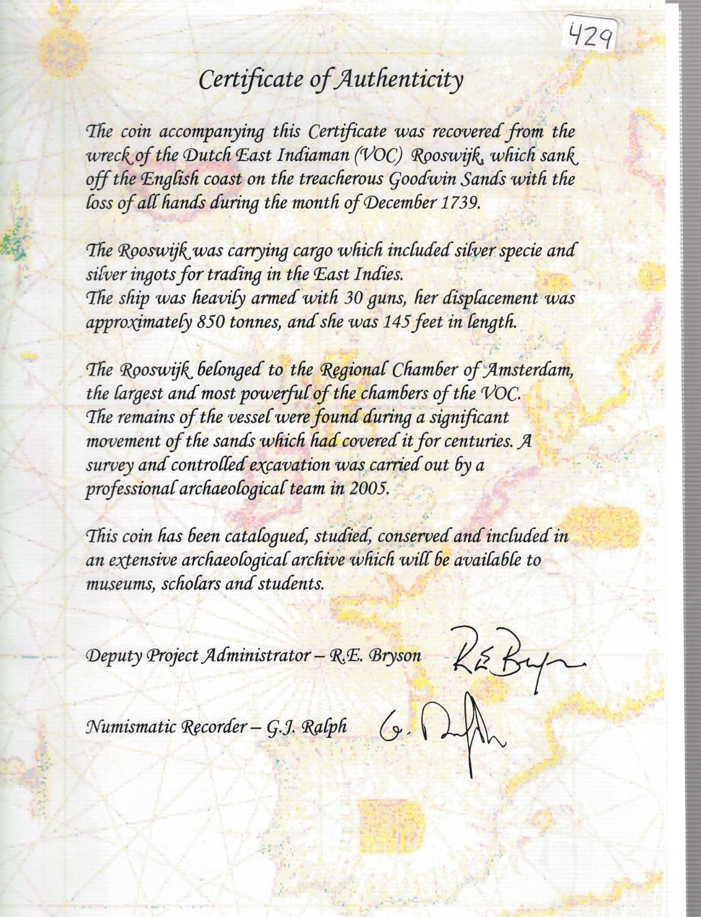 MEXICO, Mexico City, cob 8 reales, (1729-30) R. S-M24; KM-47a; Cal-Type 170. 26.59 grams. Broad, roundish flan with full oMR and decent shield, good full cross despite peripheral flatness, minimal surface corrosion, traces of toning. With original (generic) certificate from the salvors. Recovered from: Rooswijk, sunk in 1739 southeast of England