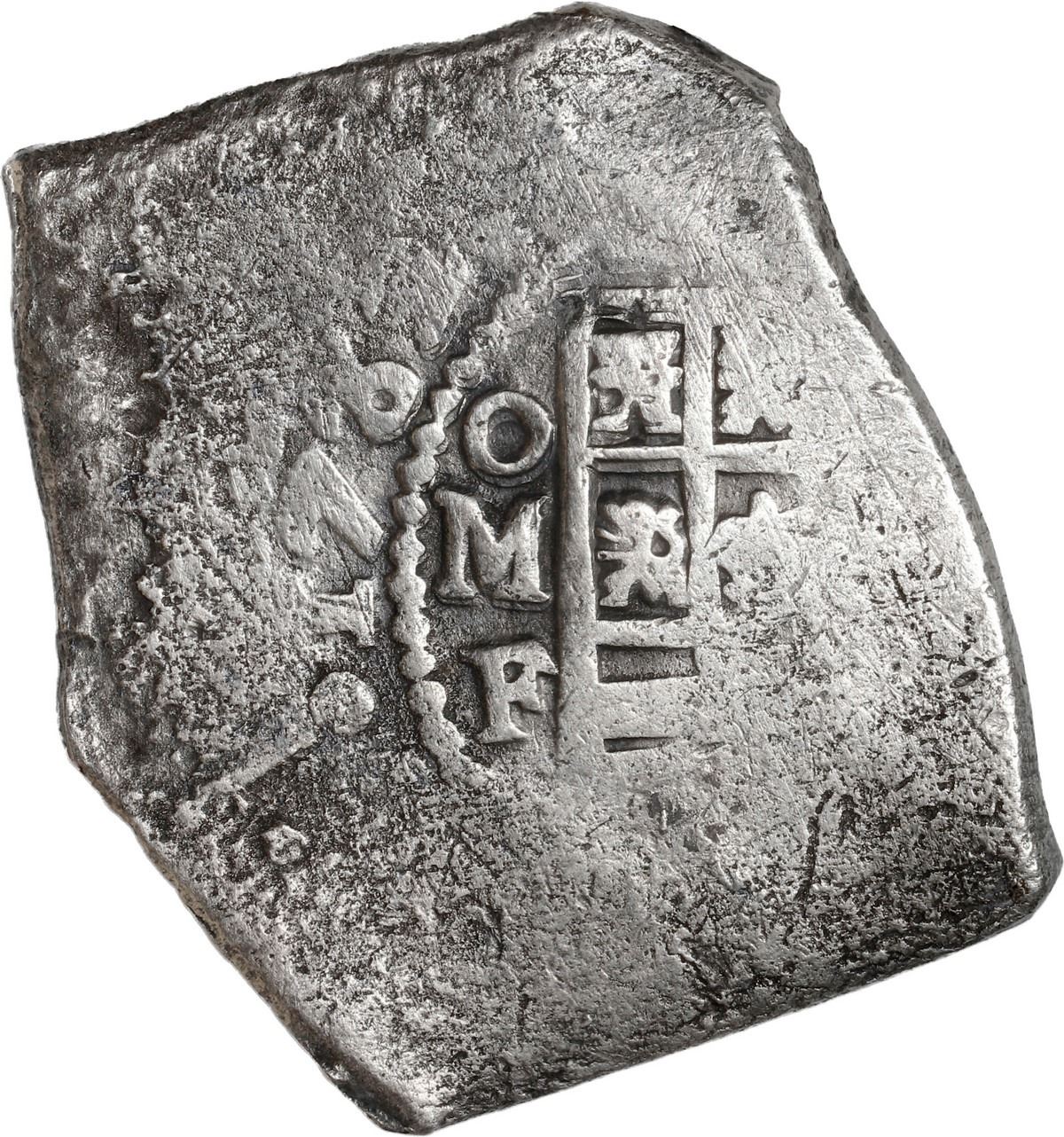 MEXICO, Mexico City, cob 8 reales, 1732 F. S-M26; KM-47a; Cal-1427. 24.12 grams. Very bold full oMF in center of flan next to four-digit date (off-center strike), most of cross, with much flatness and some corrosion in peripheries, contrastingly toned. With original certificate TC 920038 from the salvors. Recovered from: Vliegenthart, sunk in 1735 off Zeeland, Netherlands