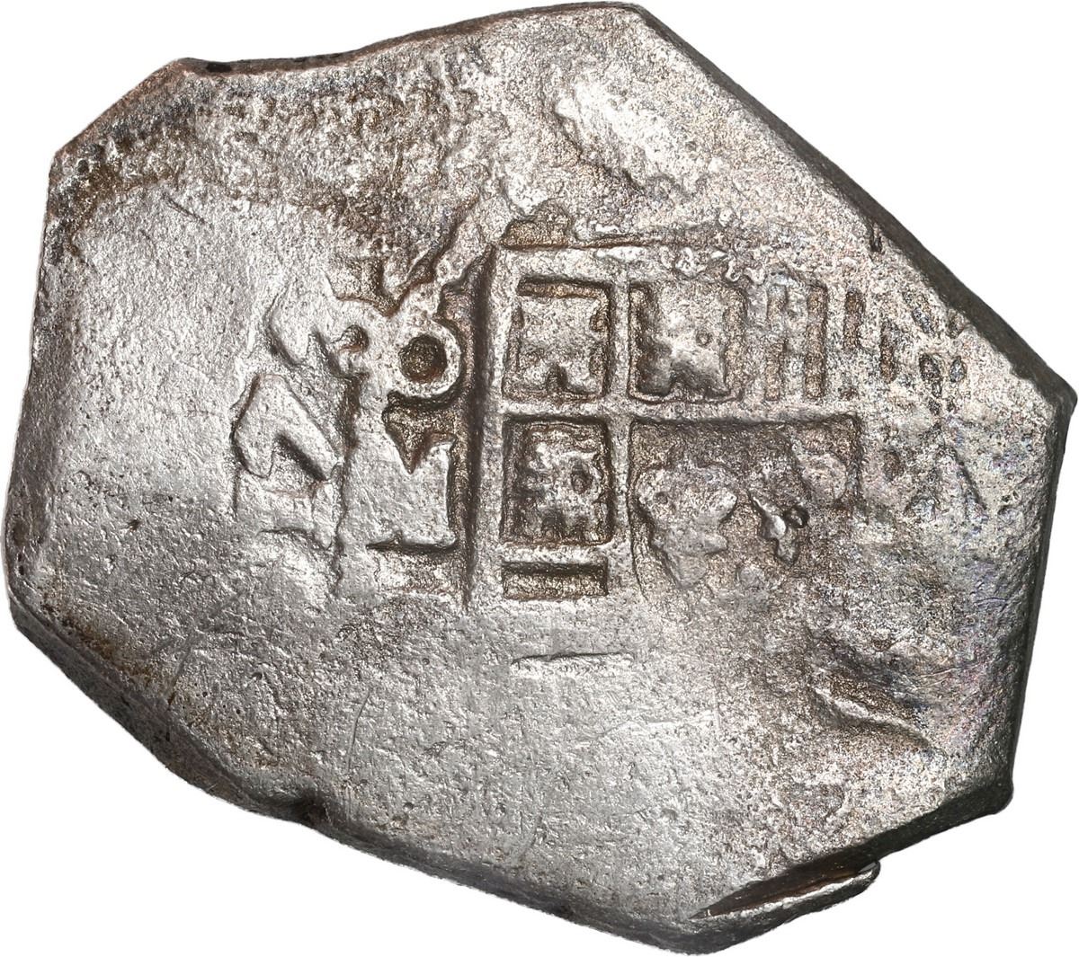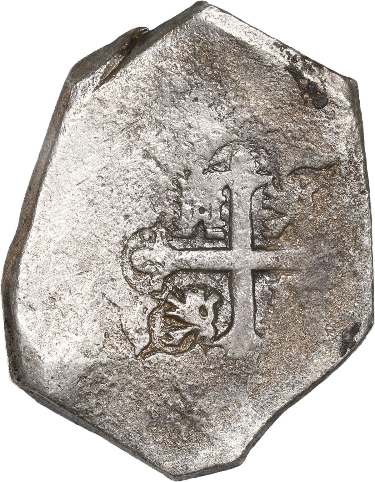 MEXICO, Mexico City, cob 8 reales, 1732 F. S-M26; KM-47a; Cal-1427. 25.45 grams. Full date and oM next to off-center shield, most of cross, peripherally flat but only lightly corroded, with faint golden toning (low contrast). With original certificate 248 from the salvors. Recovered from: Vliegenthart, sunk in 1735 off Zeeland, Netherlands