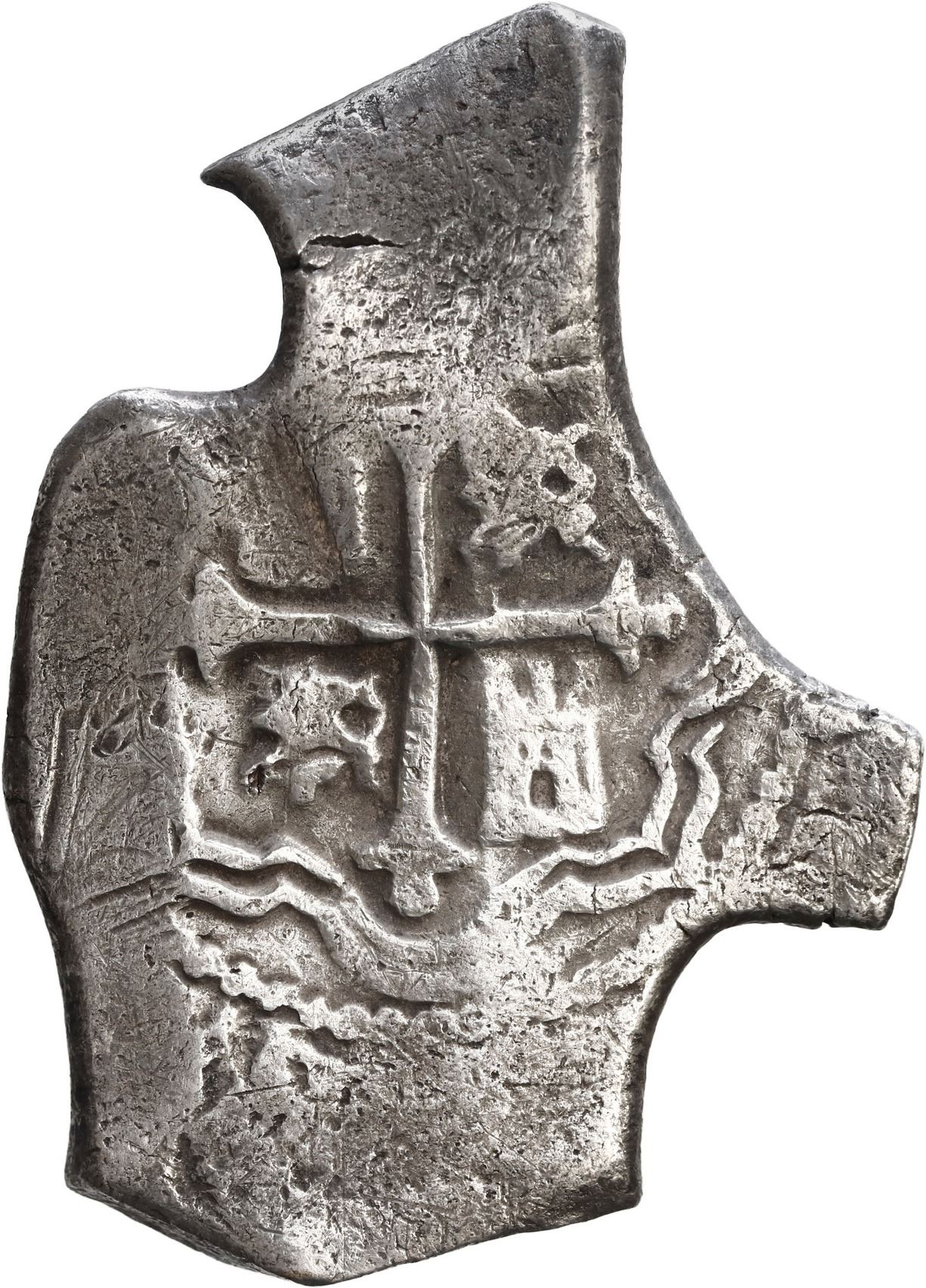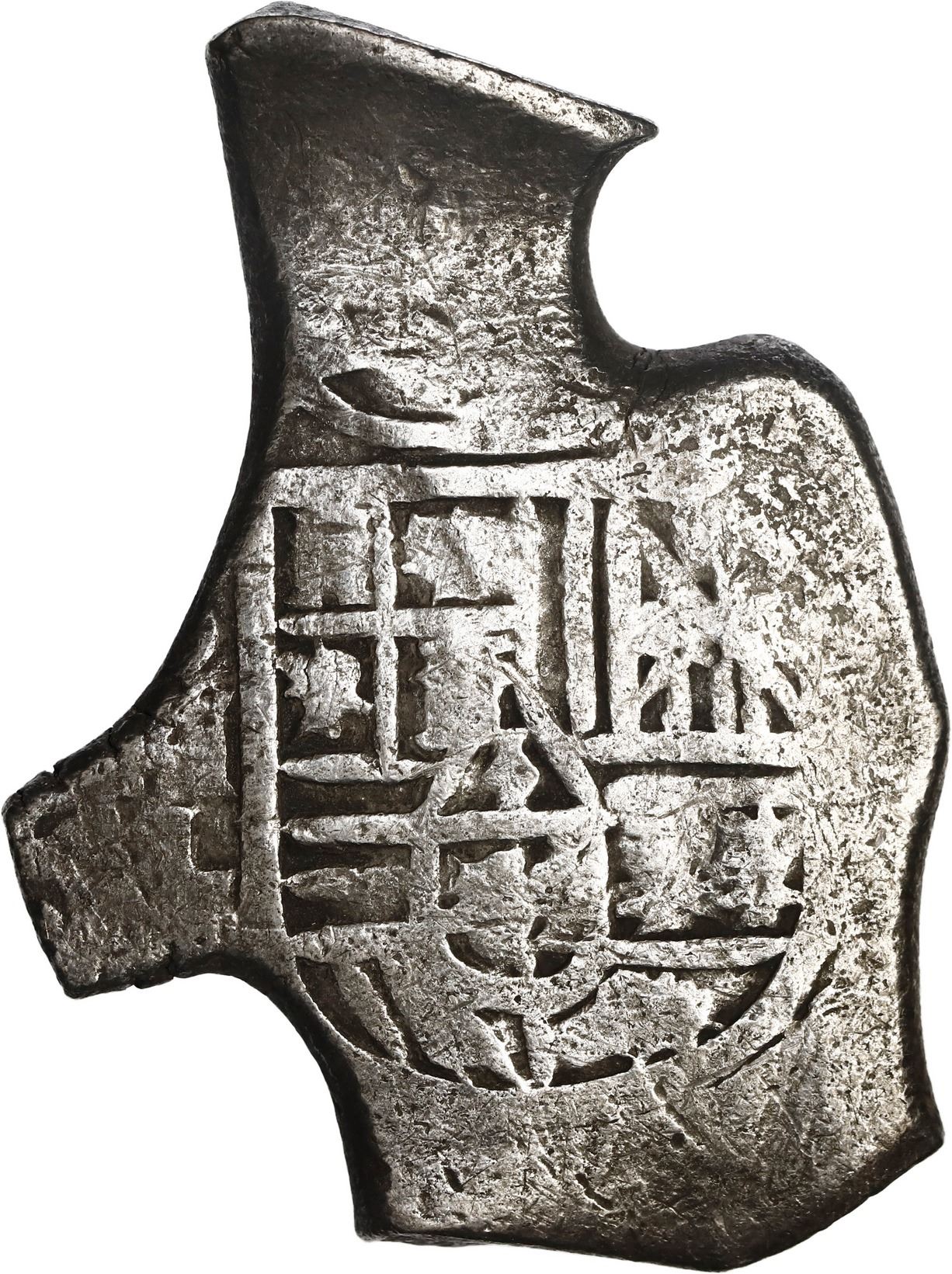 MEXICO, Mexico City, cob 8 reales, Charles II, assayer L, crazy shape. S-M21; KM-46; Cal-Type 108. 26.70 grams. Indescribably odd-shaped flan with neck at top and protrusion on side, full shield and cross, lightly toned, no corrosion (which is odd for this wreck). Pedigreed to the Steve Valentine Collection, with original certificate from the salvor/conservator. Recovered from: Joanna, sunk in 1682 off South Africa
