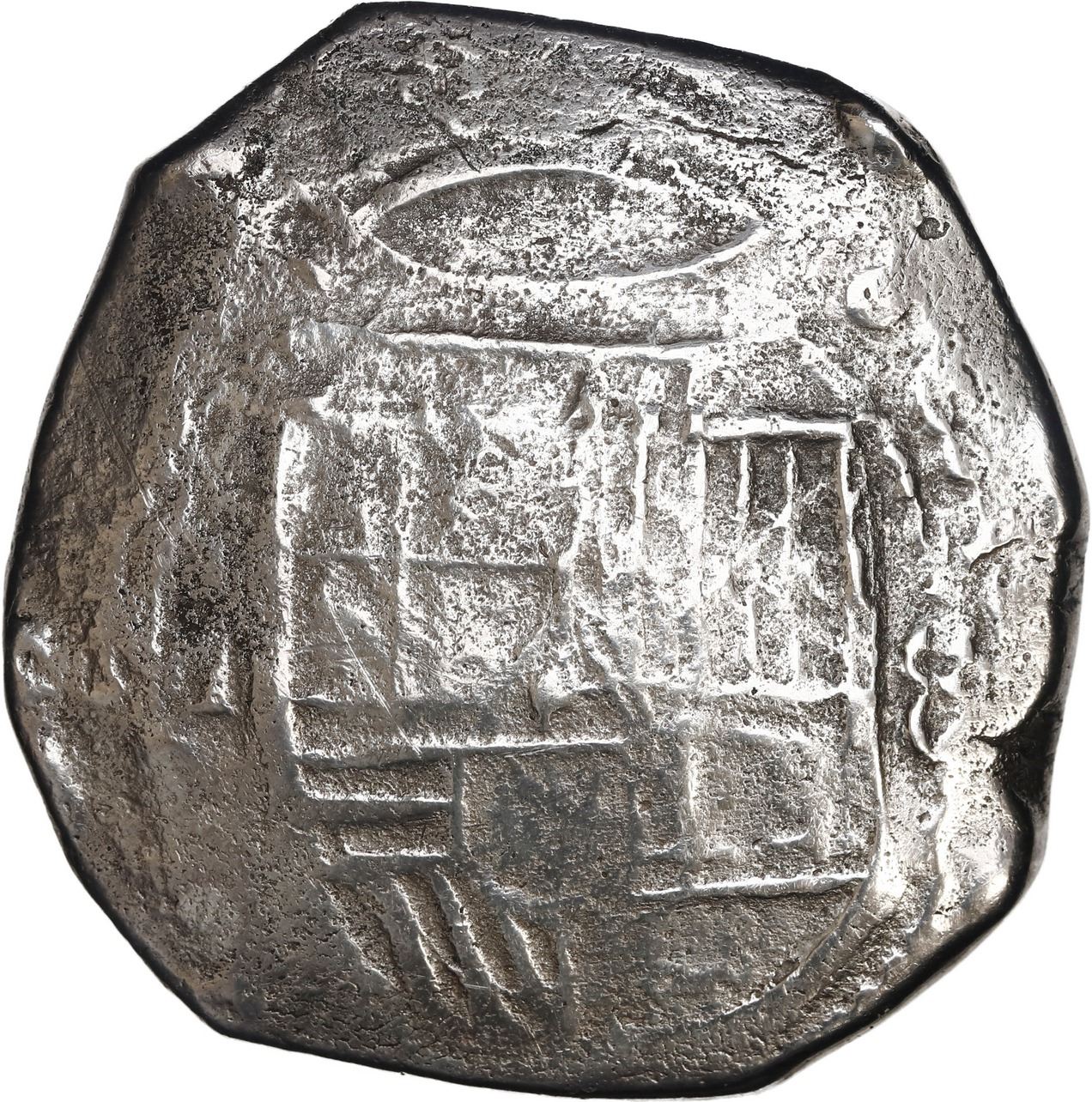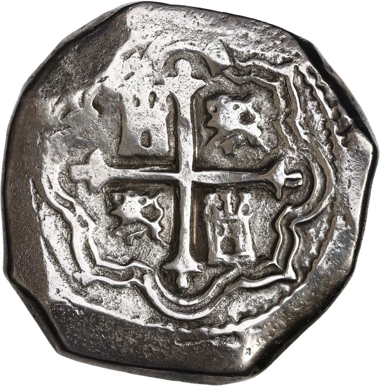 MEXICO, Mexico City, cob 8 reales, Charles II, assayer L. S-M21; KM-46; Cal-Type 108. 24.13 grams. Atypically round flan with superb full cross-lions-castles, full but weaker shield due to light corrosion, faint but certain oML to left and 8 to right inside clear •CAR- of king's name, silvery in color. Recovered from: Joanna, sunk in 1682 off South Africa