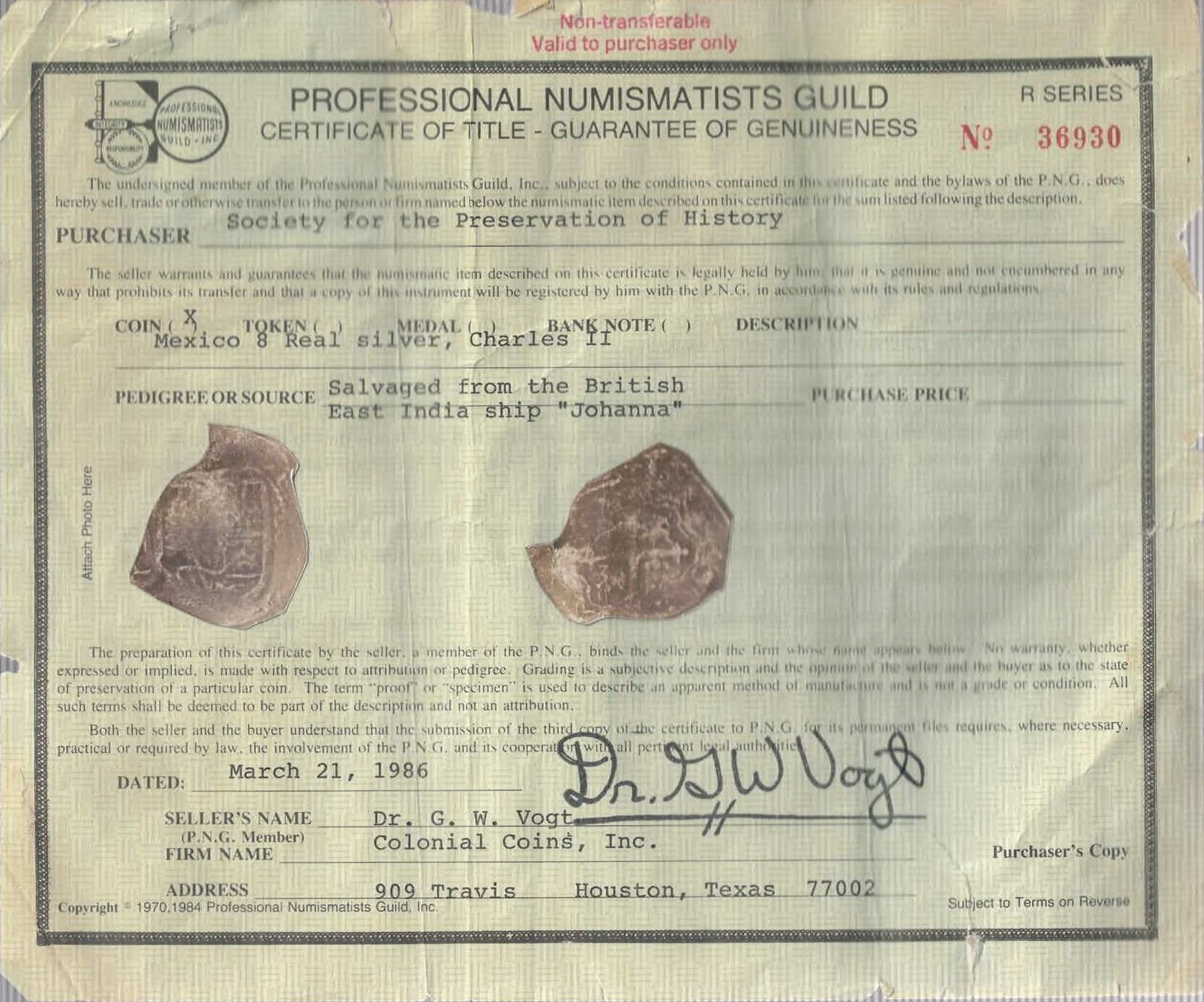 MEXICO, Mexico City, cob 8 reales, Charles II, assayer L. S-M21; KM-46; Cal-Type 108. 26.35 grams. Very thick urn-shaped flan with clear assayer, full but very weak shield and cross, light surface corrosion (much better than most for this wreck), deeply toned, classic old certificate. With 1986 PNG photo-certificate 36930 hand-signed by Dr. George W. Vogt. Recovered from: Joanna, sunk in 1682 off South Africa