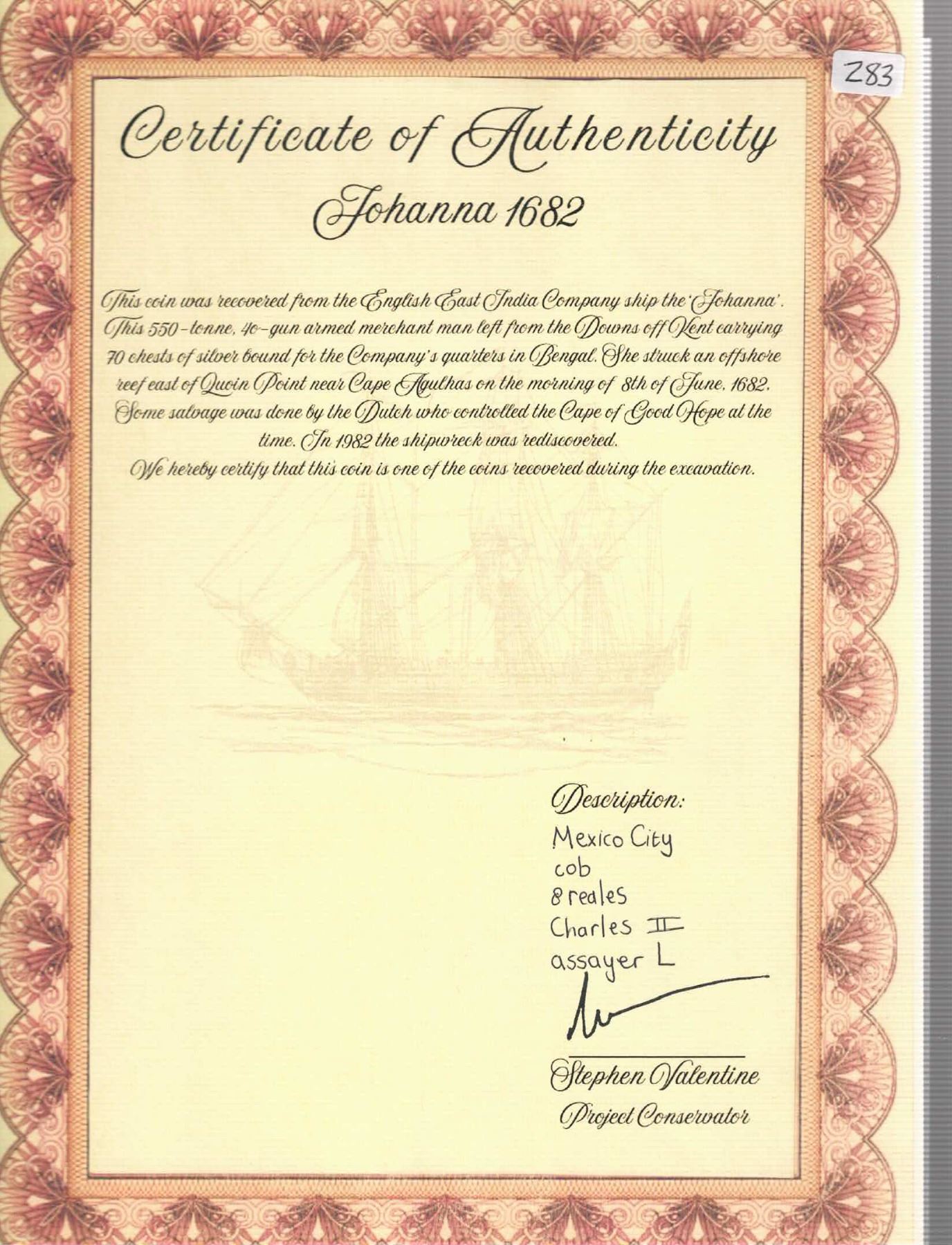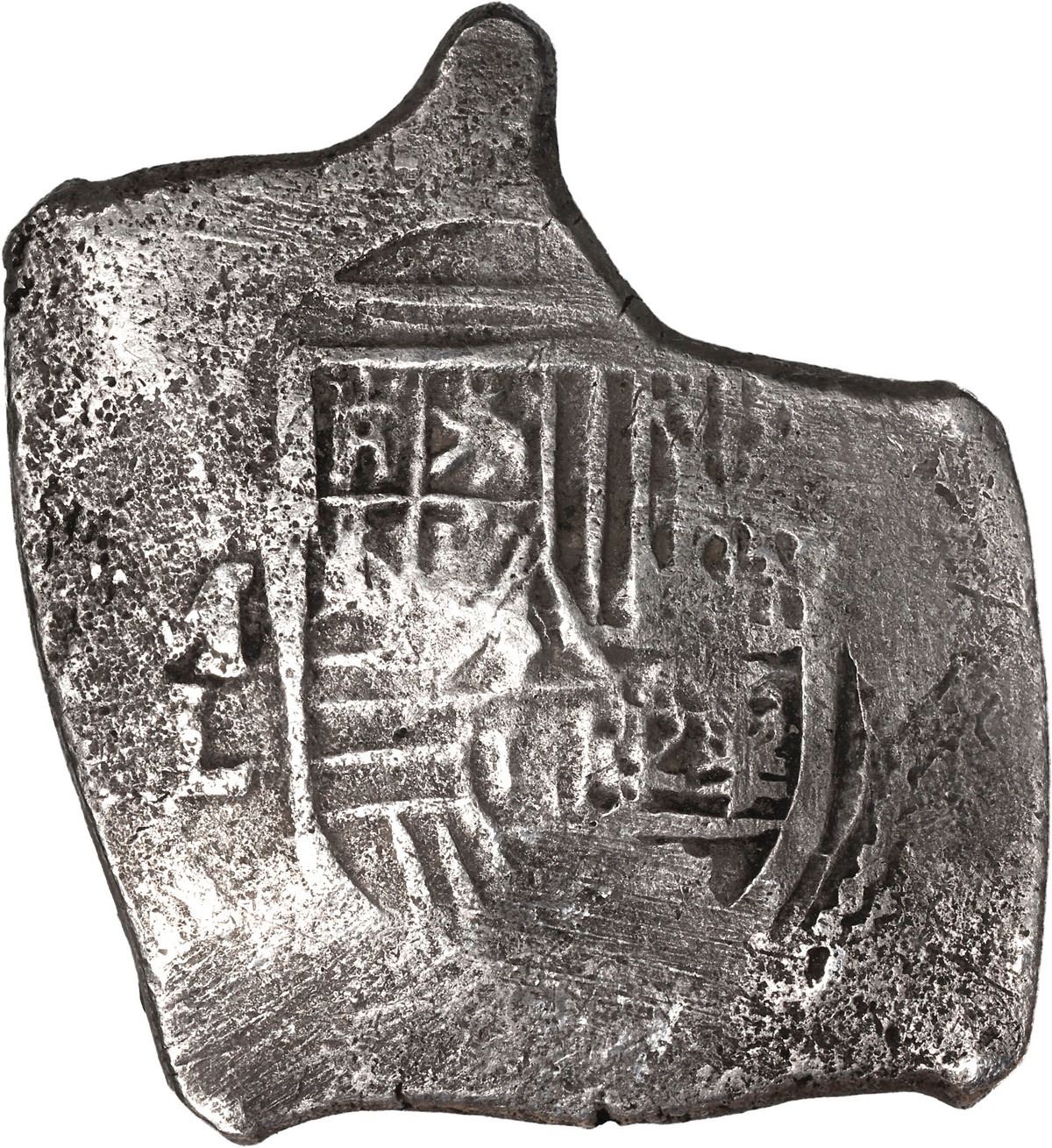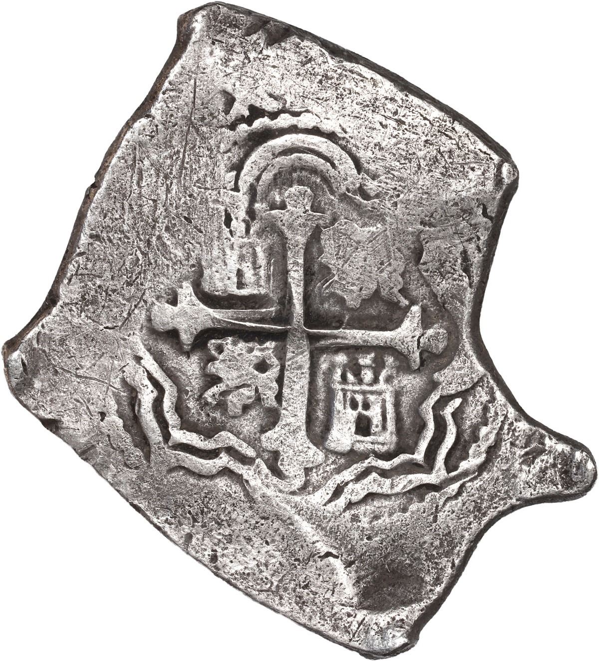 MEXICO, Mexico City, cob 8 reales, Charles II, assayer L. S-M21; KM-46; Cal-Type 108. 26.41 grams. Very odd shape (squarish with protrusion), with clear oML to left of full shield, choice full cross, rather solid for this wreck with only light corrosion, lightly toned. Pedigreed to the Steve Valentine Collection, with original certificate from the salvor/conservator. Recovered from: Joanna, sunk in 1682 off South Africa