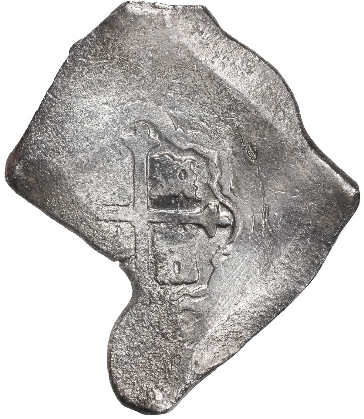 MEXICO, Mexico City, cob 8 reales, Charles II, assayer not visible, neat shape. KM-46; Cal-Type 108. 26.26 grams. Strange flan that is sort of rectangular with wide protrusion in one corner, most of shield and cross but peripheries flat, only light surface corrosion, lightly toned. Recovered from: Joanna, sunk in 1682 off South Africa