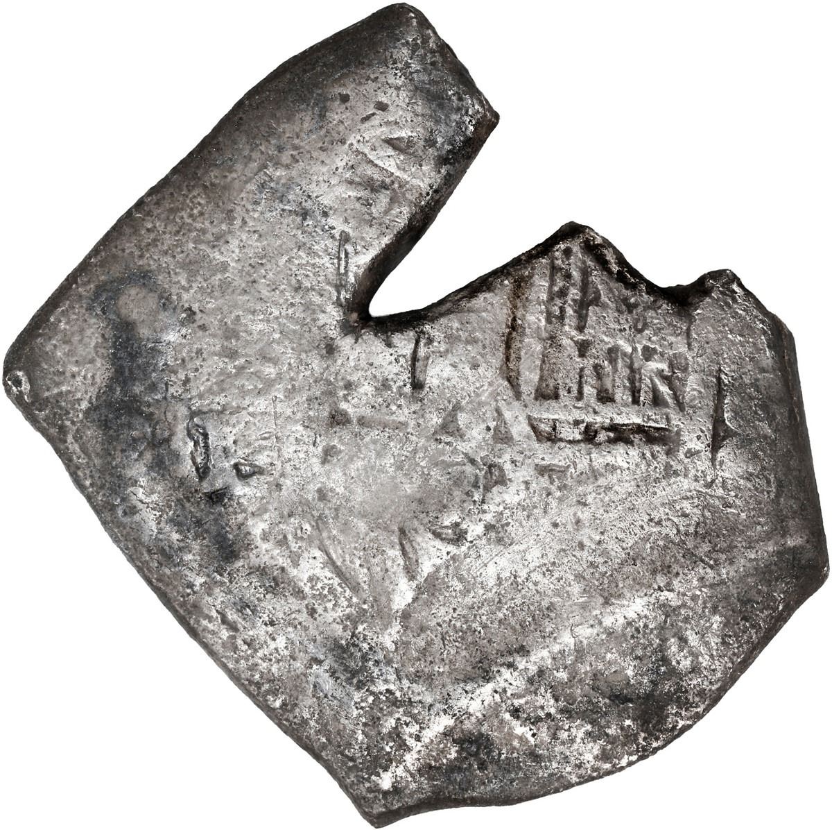 MEXICO, Mexico City, cob 8 reales, Charles II, assayer not visible, neat shape. KM-46; Cal-Type 108. 23.97 grams. Crazy rectangle with deep notch (as made), rather solid for this wreck but with very little detail due to weak strike and light corrosion, mostly toned. Recovered from: Joanna, sunk in 1682 off South Africa