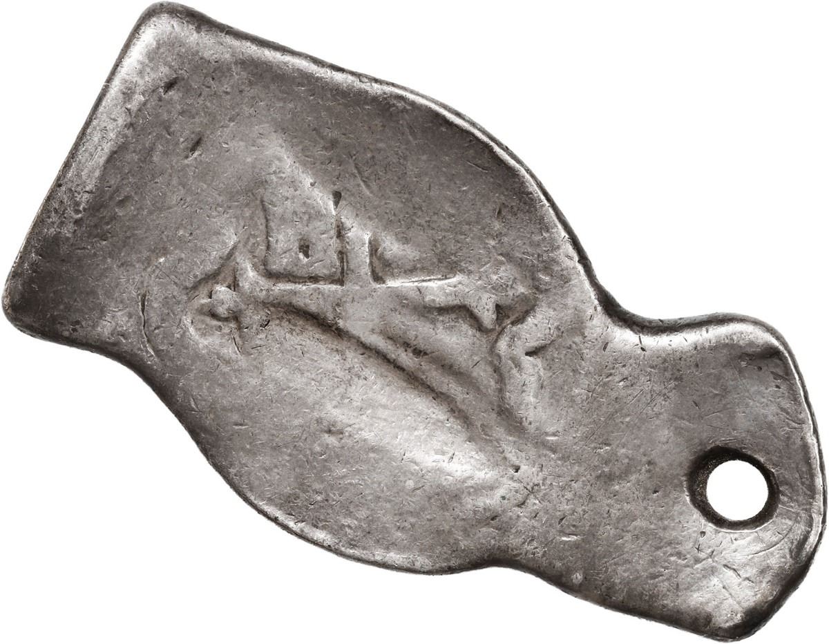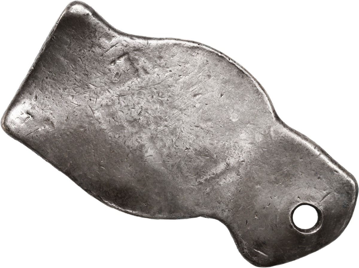 MEXICO, Mexico City, cob 8 reales, Charles II, assayer not visible, neat shape. KM-46; Cal-Type 108. 25.21 grams. Sort of a narrow barrel-shape with one end rounded (and holed in that end), weak shield, most of cross with as-made hammer-mark, richly old-toned Good.