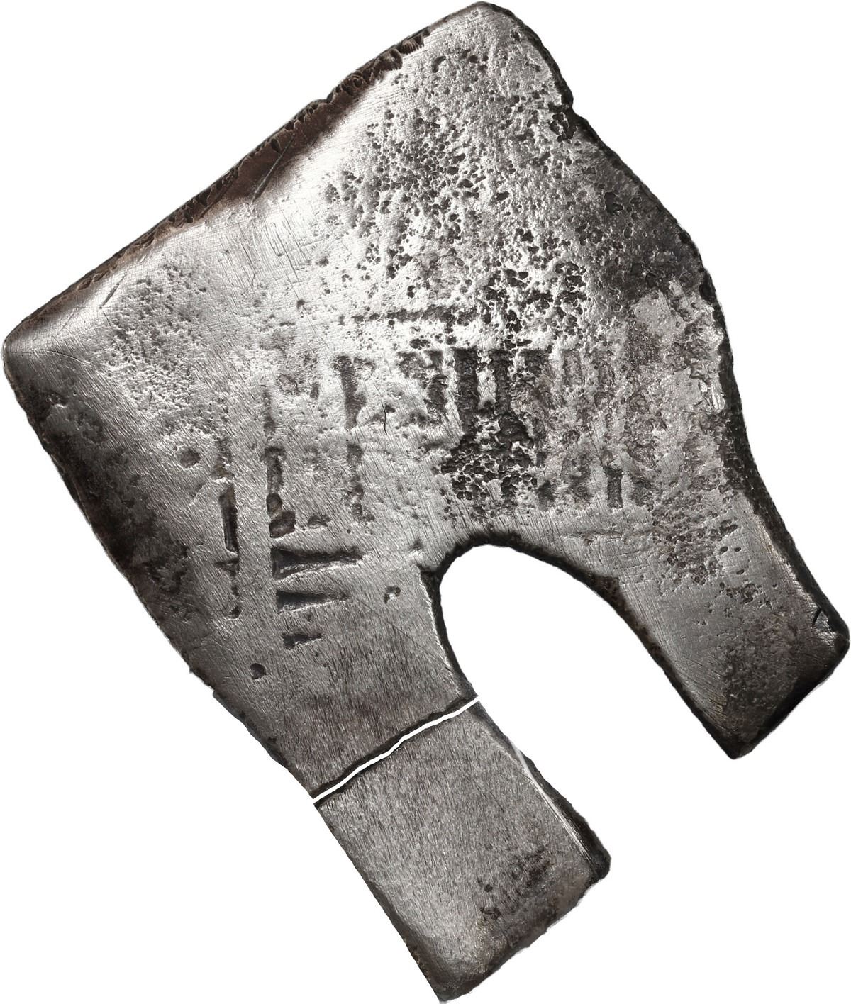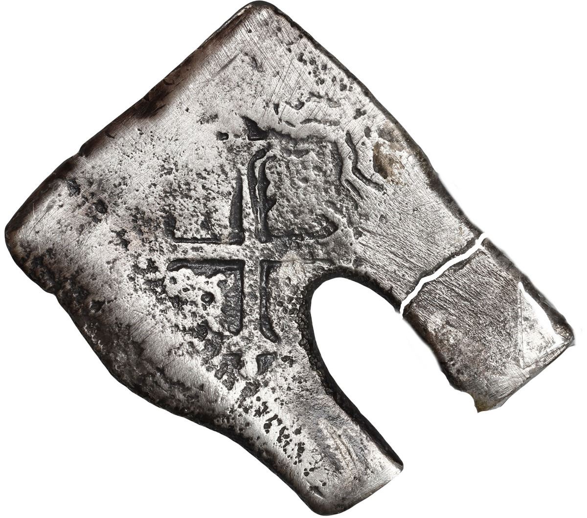 MEXICO, Mexico City, cob 8 reales, Charles II, assayer not visible, very odd shape with small piece broken off. KM-46; Cal-Type 108. 20.75 grams. Squarish flan with large notch (as made), one of the two "arms" next to the notch broken off (taped back together), most of shield and cross despite very weak strike and light corrosion, toned in crevices. Recovered from: Joanna, sunk in 1682 off South Africa