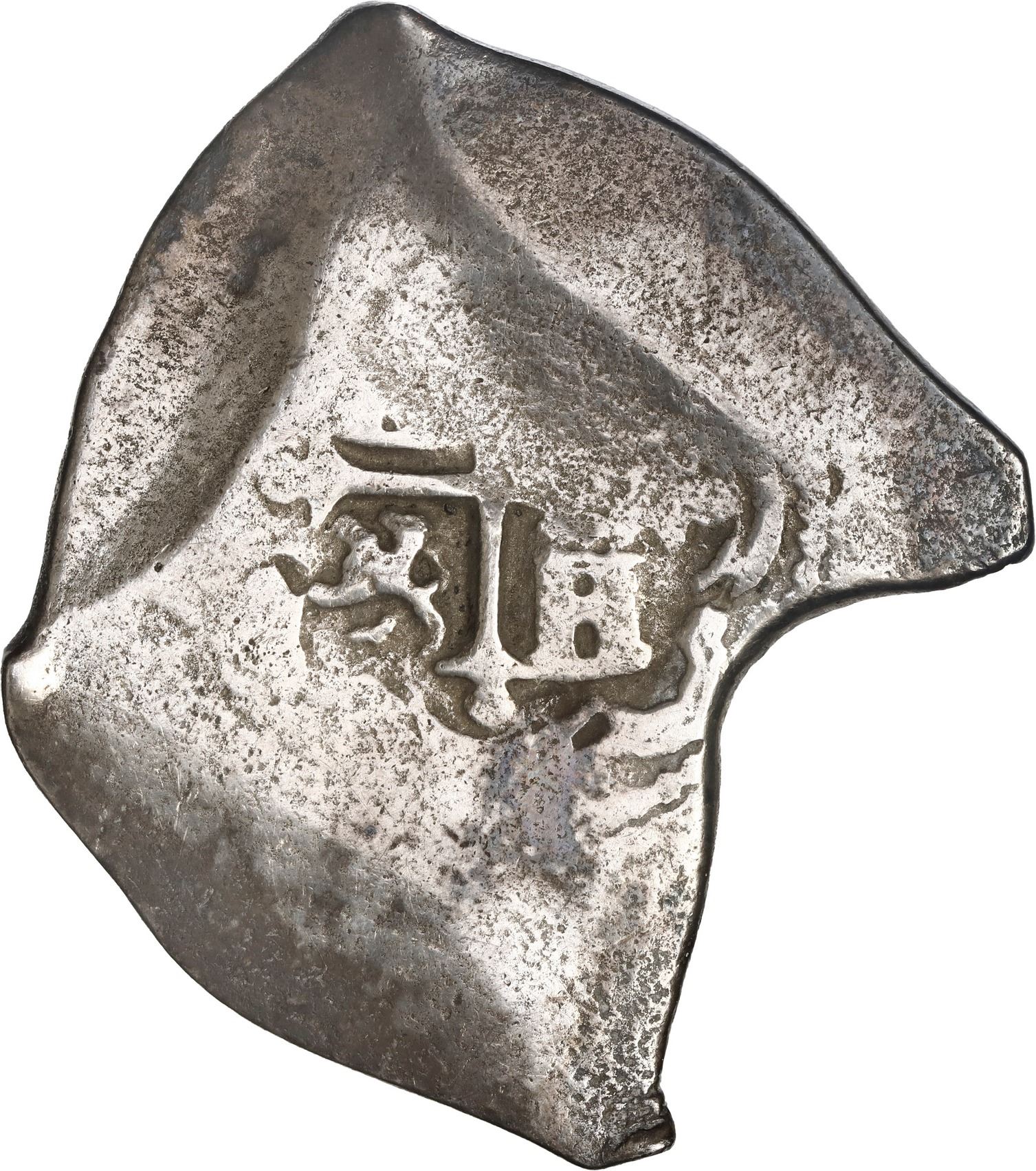 MEXICO, Mexico City, cob 8 reales, Charles II, assayer not visible. KM-46; Cal-Type 108. 22.98 grams. Broad, odd-shaped flan with slightly blunted points, lots of peripheral flatness (as made) but minimal corrosion (low weight notwithstanding), some cross, most of shield with full denomination oo to right. Recovered from: Joanna, sunk in 1682 off South Africa