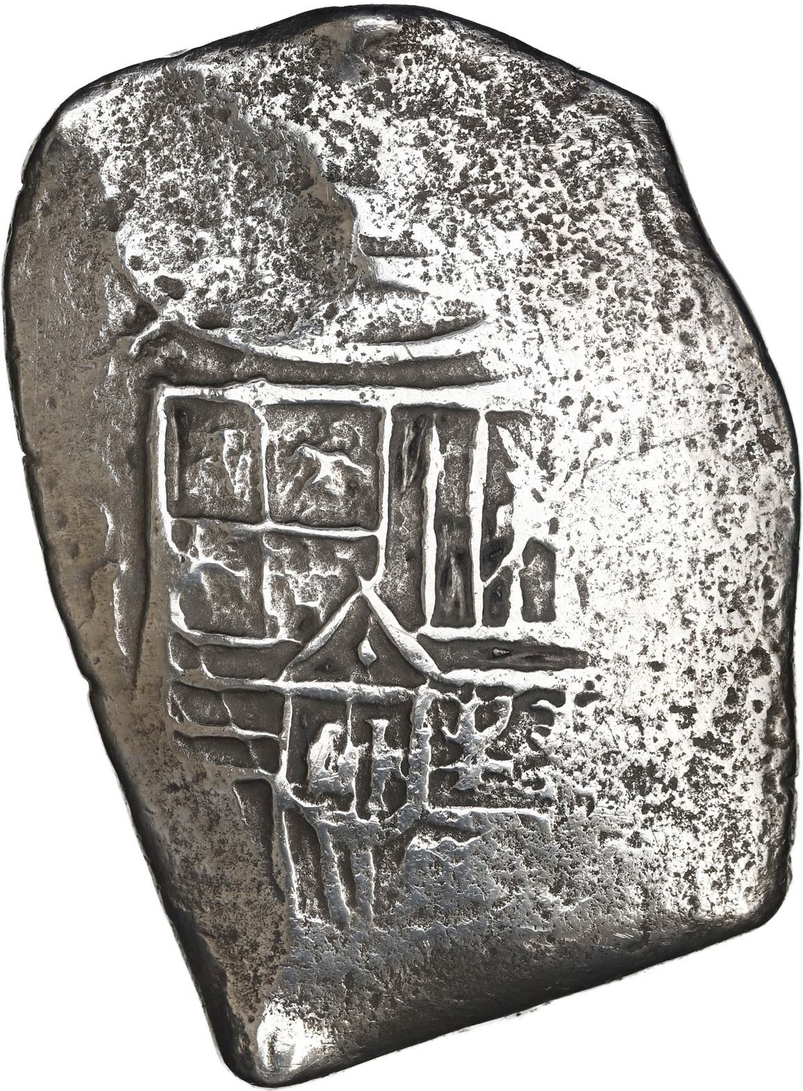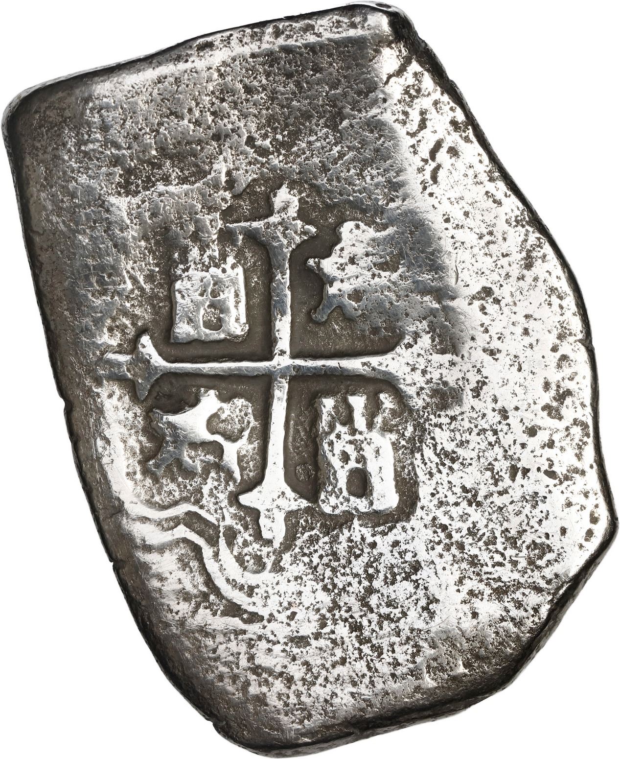 MEXICO, Mexico City, cob 8 reales, Charles II, assayer not visible. KM-46; Cal-Type 108. 20.90 grams. Nice full cross and shield, peripherally flat, thin from corrosion but surfaces smooth, silvery in color. Recovered from: Joanna, sunk in 1682 off South Africa