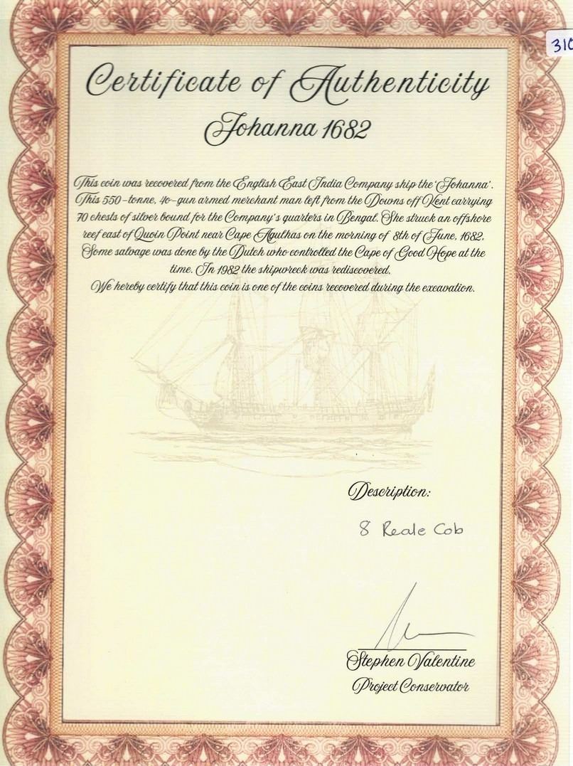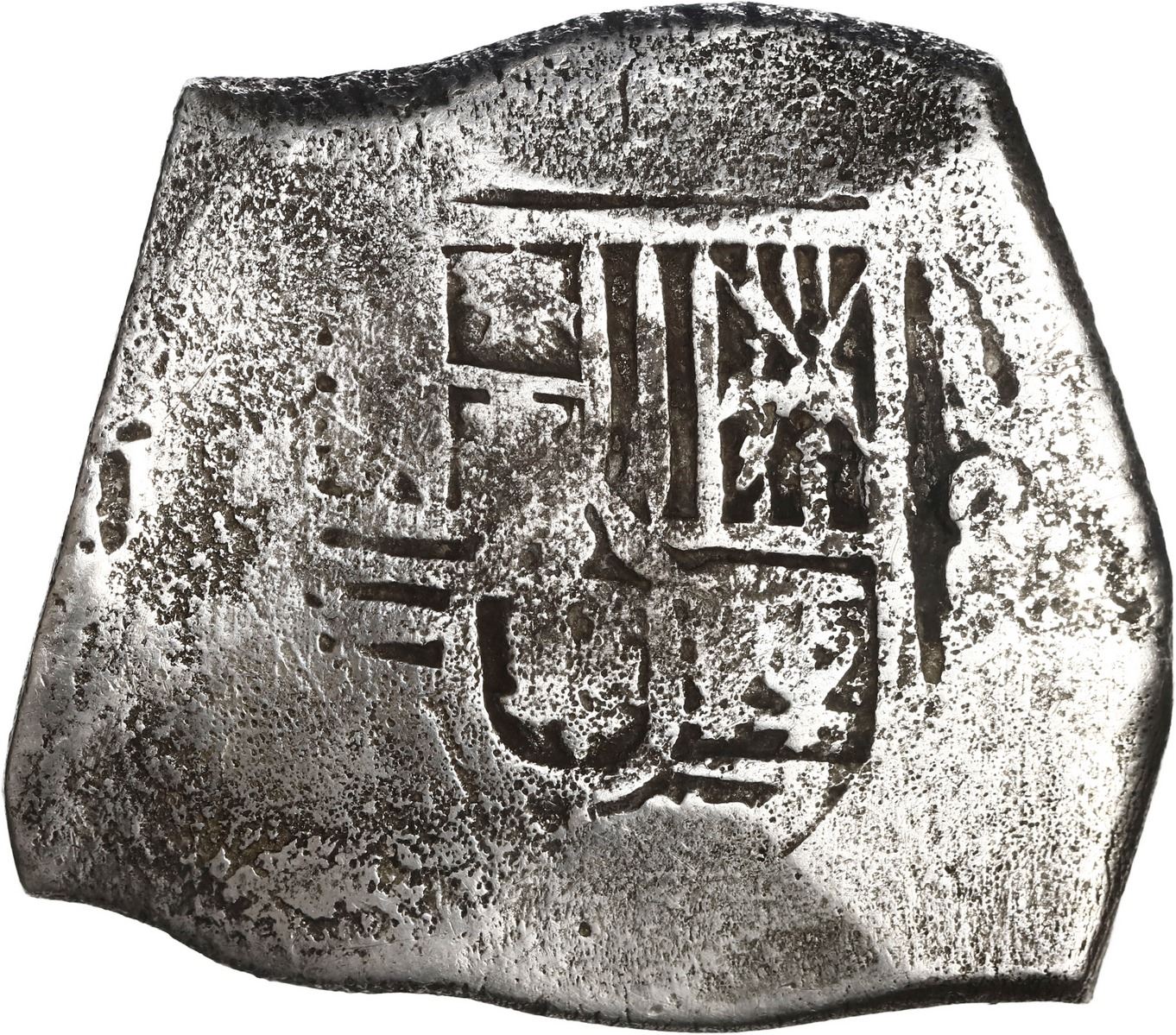 MEXICO, Mexico City, cob 8 reales, Charles II, assayer not visible. KM-46; Cal-Type 108. 23.73 grams. Nearly full shield and cross but peripheries typically flat (and with as-made hammer-mark on reverse), solid and visually corrosion-free, toned in crevices. Pedigreed to the Steve Valentine Collection, with original certificate from the salvor/conservator. Recovered from: Joanna, sunk in 1682 off South Africa