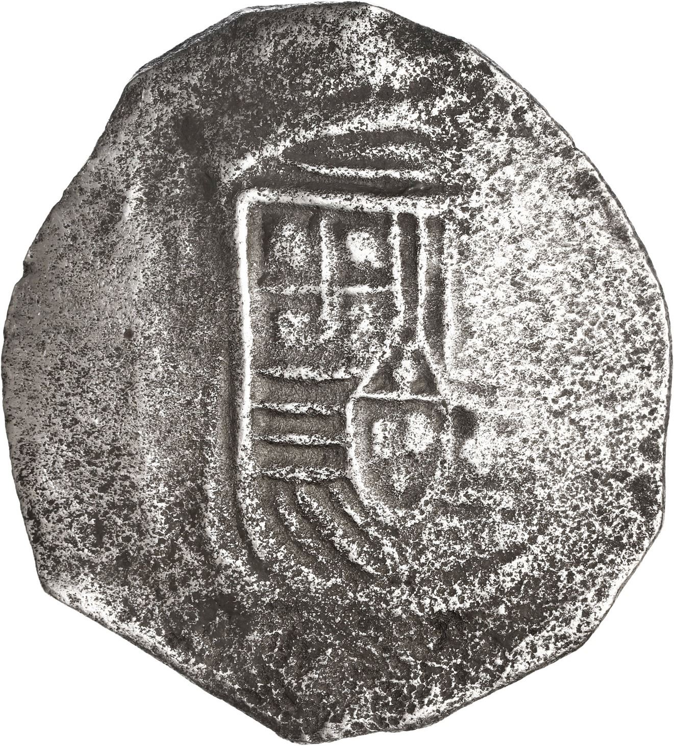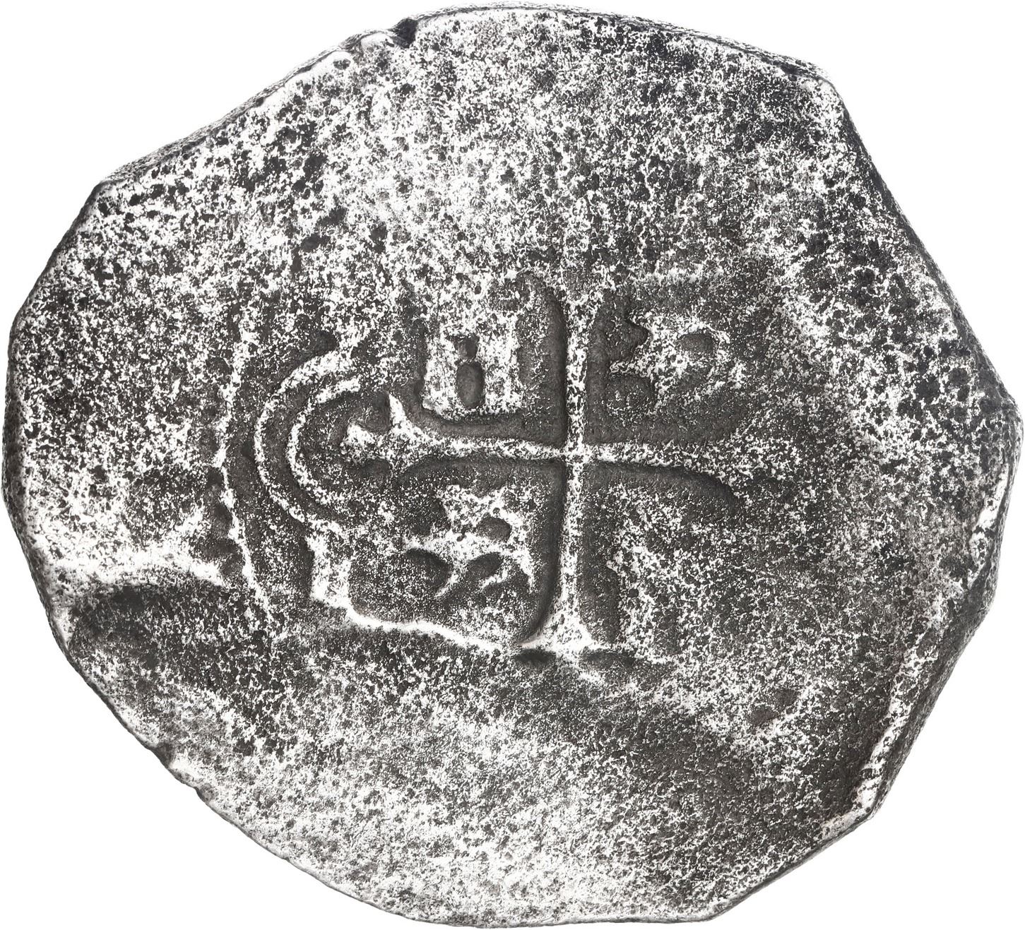 MEXICO, Mexico City, cob 8 reales, Charles II, assayer not visible. KM-46; Cal-Type 108. 18.94 grams. Broad, somewhat oval flan with full cross and shield (the latter slightly off-center) but peripheries flat, thin from corrosion but overall choice for this wreck, lightly toned. Pedigreed to the Steve Valentine Collection, with original certificate from the salvor/conservator. Recovered from: Het Huis te Cruyenstein, sunk in 1698 off South Africa