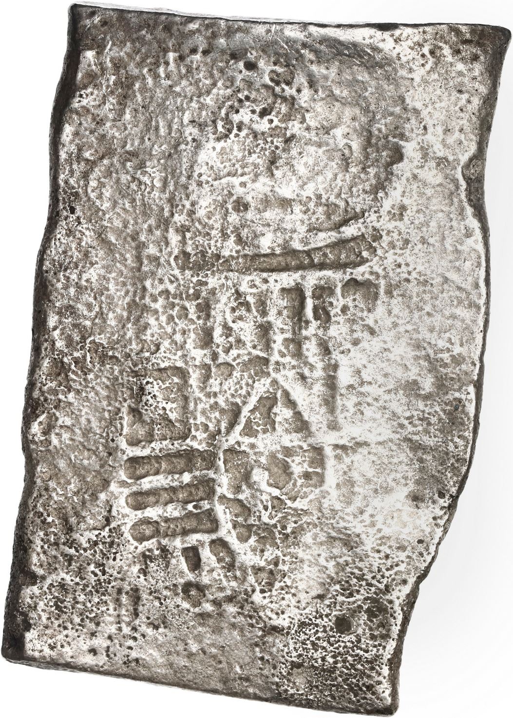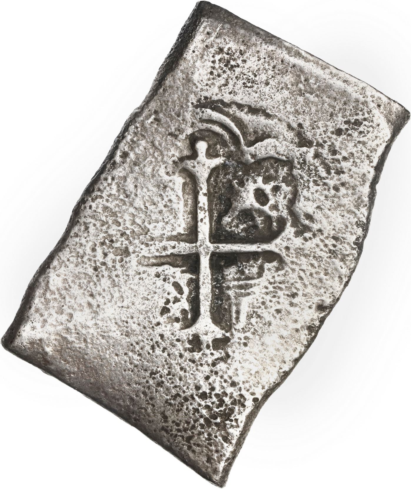 MEXICO, Mexico City, cob 8 reales, Charles II, assayer not visible. KM-46; Cal-Type 108. 21.82 grams. Neatly rectangular shape with bold cross and most of shield but moderately corroded all over, lightly toned (darker in crevices around cross). Pedigreed to the Steve Valentine Collection, with original certificate from the salvor/conservator. Recovered from: Het Huis te Cruyenstein, sunk in 1698 off South Africa