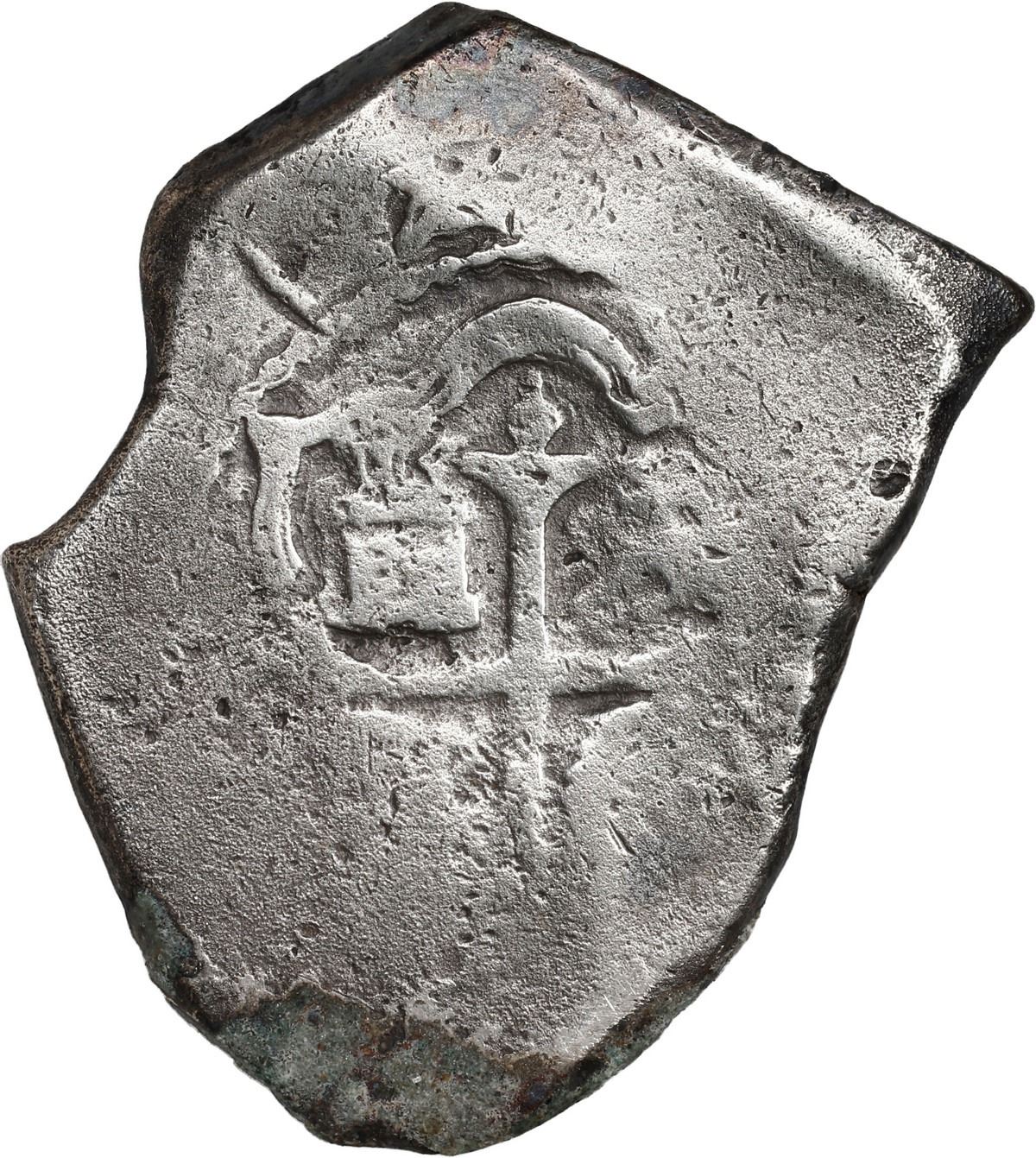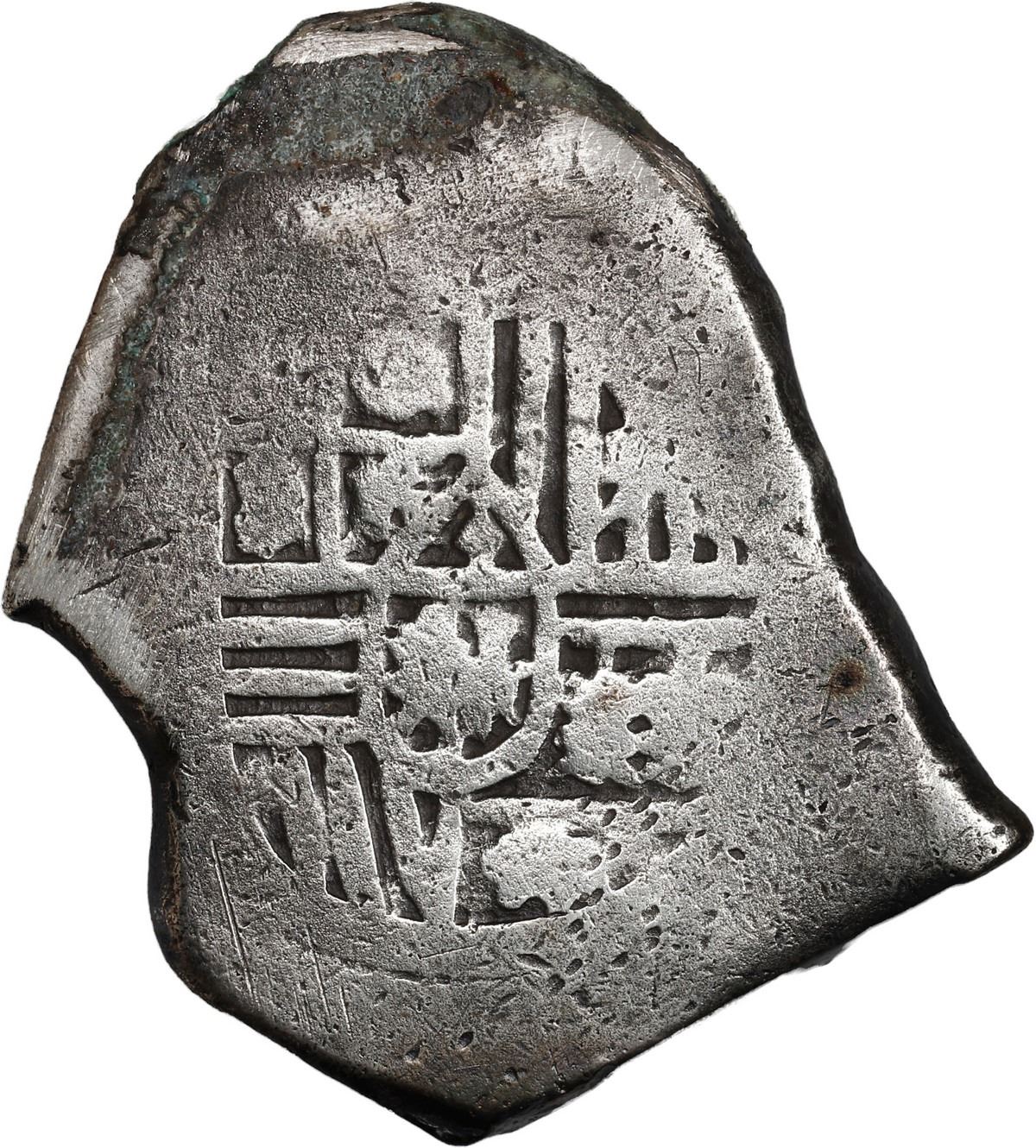 MEXICO, Mexico City, cob 8 reales, Charles II, assayer not visible. KM-46; Cal-Type 108. 26.34 grams. Slightly odd shape with multiple curves and a point, full shield and nearly full cross, lightly toned, solid and nearly corrosion-free with patch of greenish coral at one end. Recovered from: Spanish 1715 Fleet, sunk off the east coast of Florida