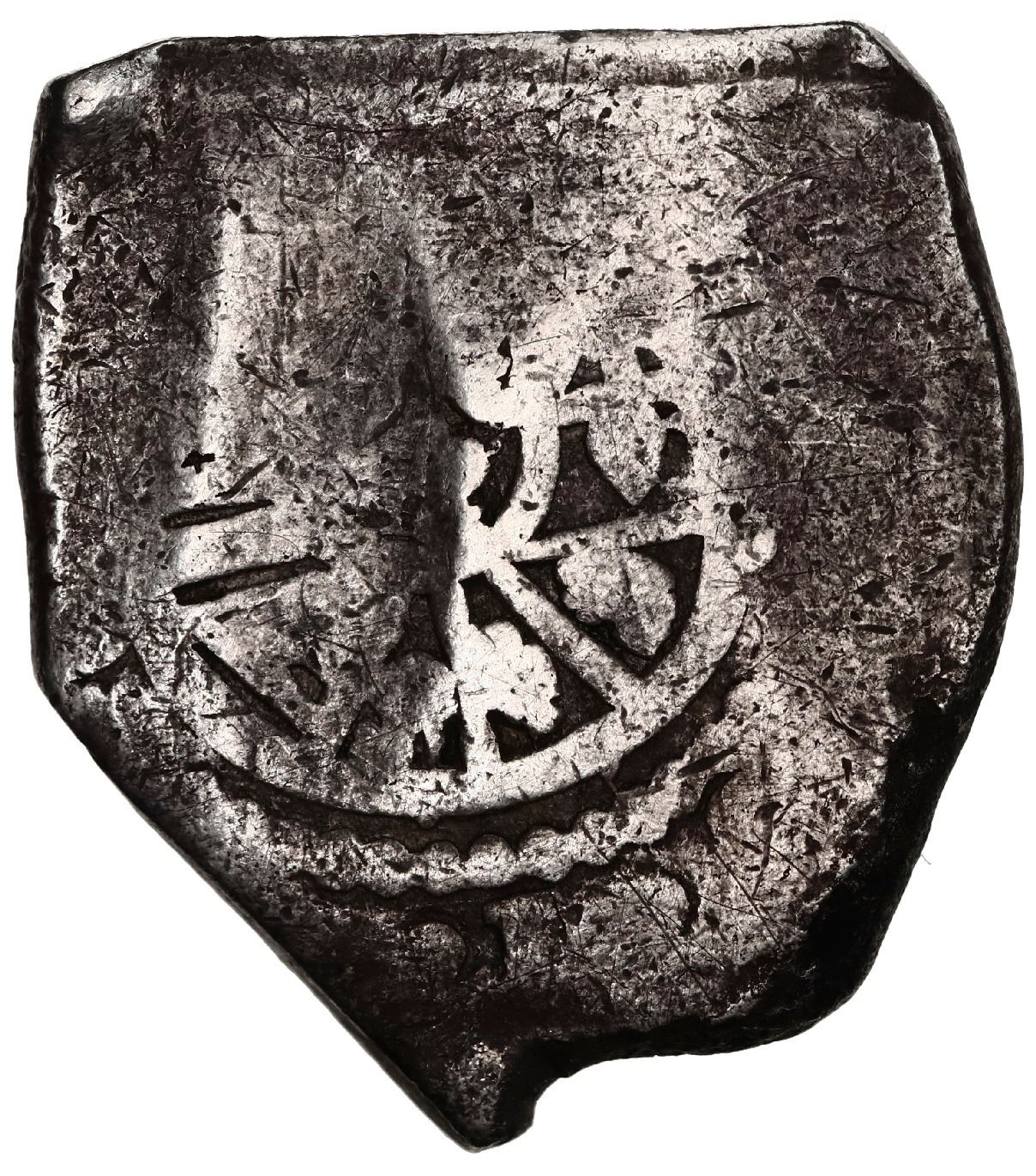 MEXICO, Mexico City, cob 8 reales, Louis I, (1724-25) (D), very rare. S-M23; KM-49; Cal-Type 25. 26.45 grams. Solid flan with no corrosion but weakly struck (much flatness), clear shield and cross nonetheless but significantly with king's ordinal I visible in legend above a blunted point in the edge of an odd-shaped flan with straight edge terminating in other blunt points (looks like the state of Ohio), toned all over, one of less than five examples known to us with any part of king's name and/or ordinal visible (excluding Royals). With certificate (generic). Recovered from: Rooswijk, sunk in 1739 southeast of England