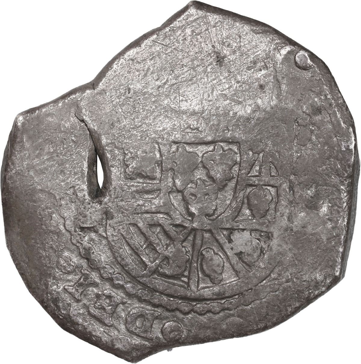 MEXICO, Mexico City, cob 8 reales, Louis I or Philip V, assayer D, small natural bubble-hole. 26.61 grams. Very solid and uncorroded but darkly toned all over, with most of shield and cross visible despite peripheral flatness, the interior hole strangely thin and narrow. With generic certificate from the salvors. Recovered from: Vliegenthart, sunk in 1735 off Zeeland, Netherlands