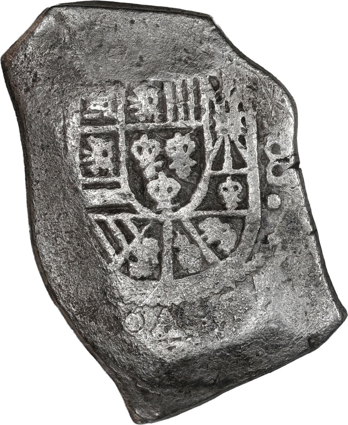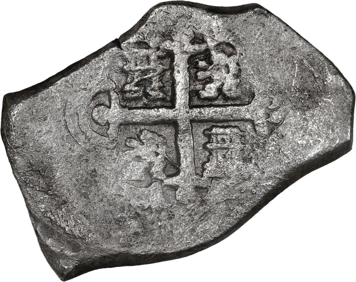 MEXICO, Mexico City, cob 8 reales, Louis I or Philip V, assayer not visible, style of 1725-33. 25.54 grams. More or less rectangular flan with good full cross and shield, bold denomination 8, light corrosion only, light toning in crevices. With original certificate from the salvors, and pedigreed to Sedwick Auction 8, with original lot-tag 968. Recovered from: Rooswijk, sunk in 1739 southeast of England