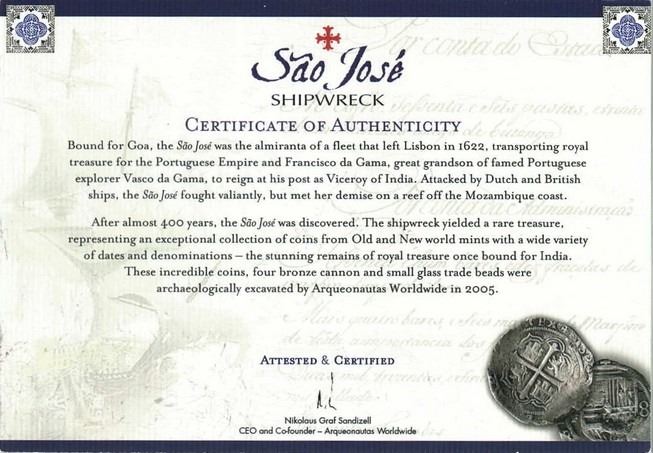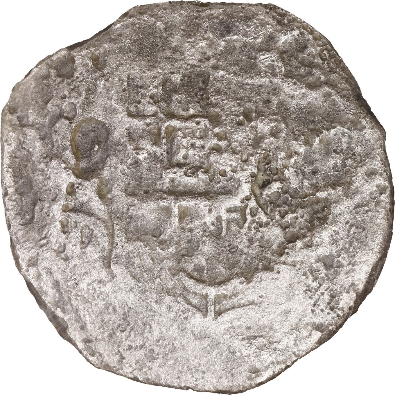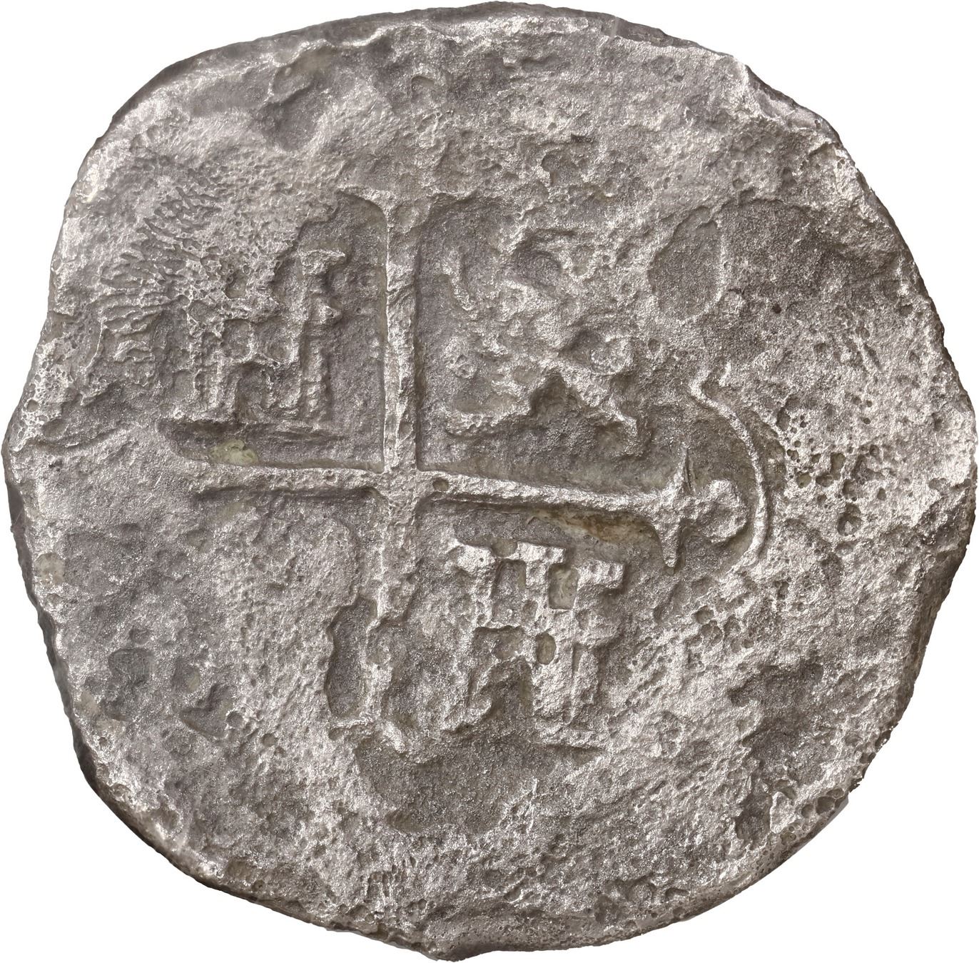 MEXICO, Mexico City, cob 8 reales, Philip III, assayer D, NGC Shipwreck Effect (São José Shipwreck Label). S-M18; KM-44.3; Cal-Type 162. Solid piece with some pitting, partial shield with clear assayer at left, decent cross detail. With (generic) certificate from the salvors. Recovered from: São José, sunk in 1622 off Mozambique, east of Africa