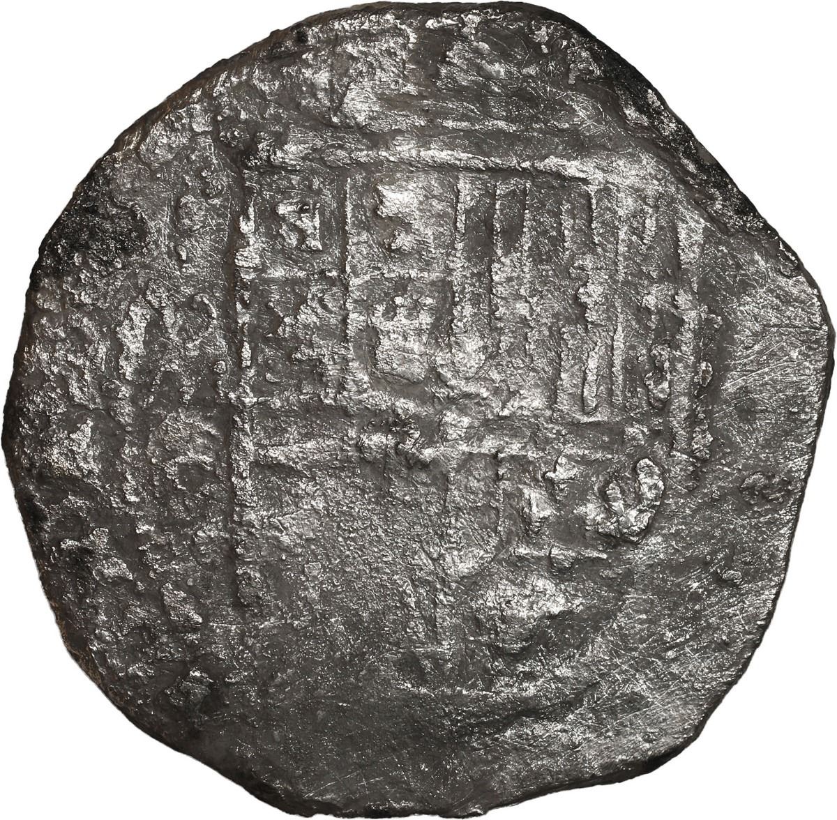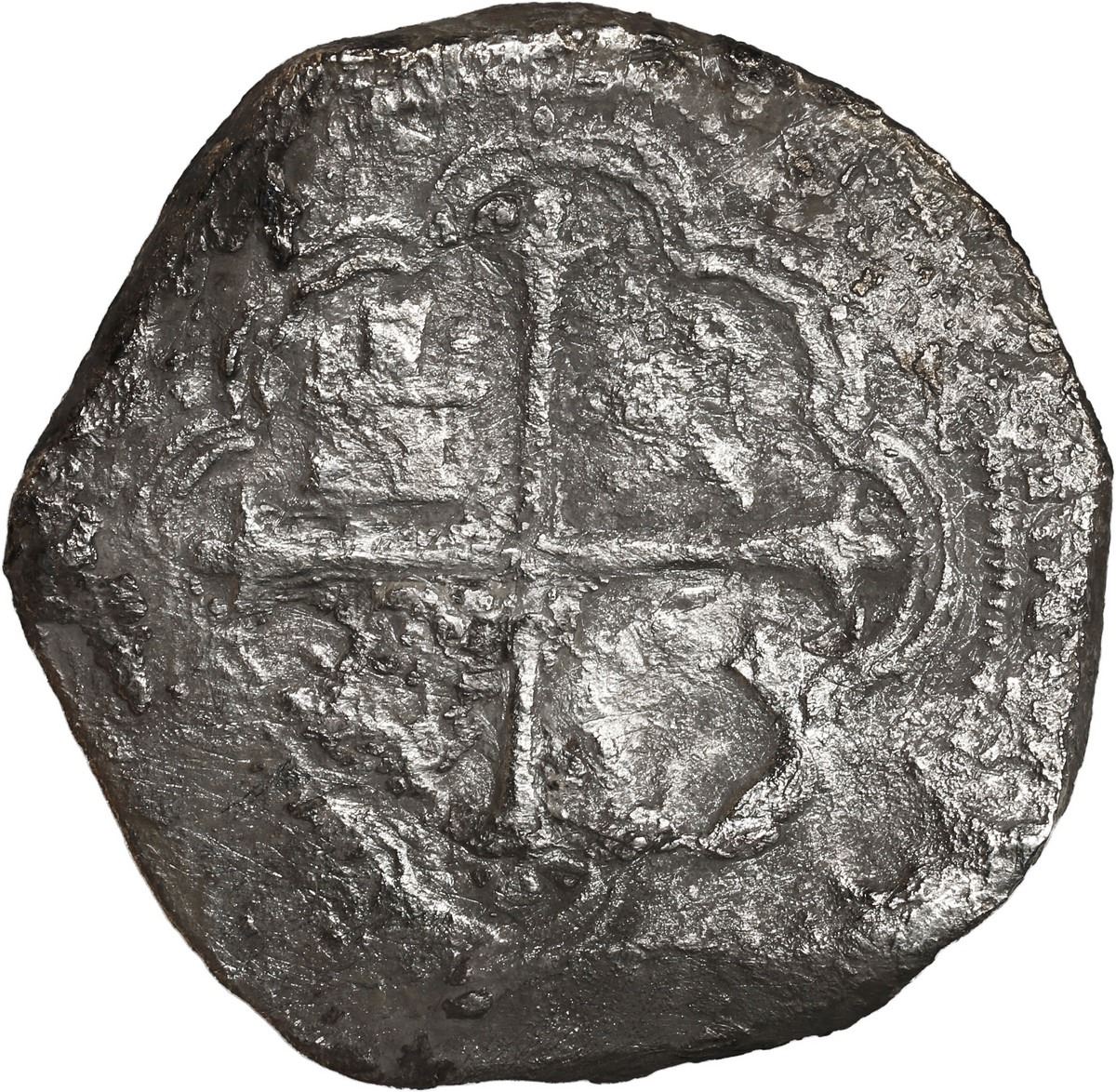 MEXICO, Mexico City, cob 8 reales, Philip III, assayer F. KM-44.3. 21.74 grams. Solid piece with moderate corrosion yet still showing off a nearly complete shield and full cross, a few small spots of horn silver around the edges, a rather scarce provenance and among the nicer examples seen from this wreck. Recovered from: "Rill Cove Wreck," sunk ca. 1618 off Cornwall, England