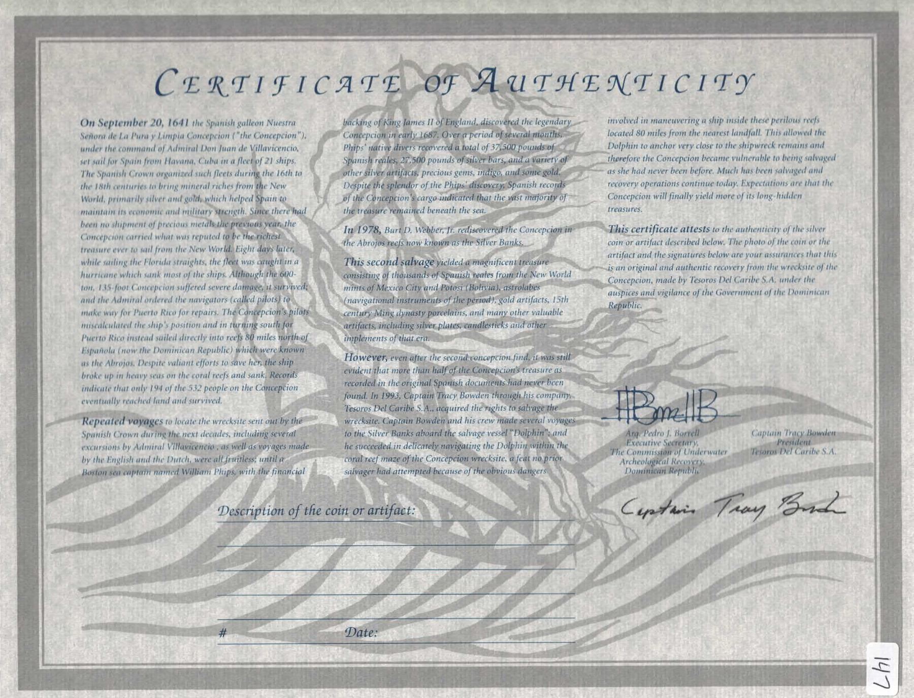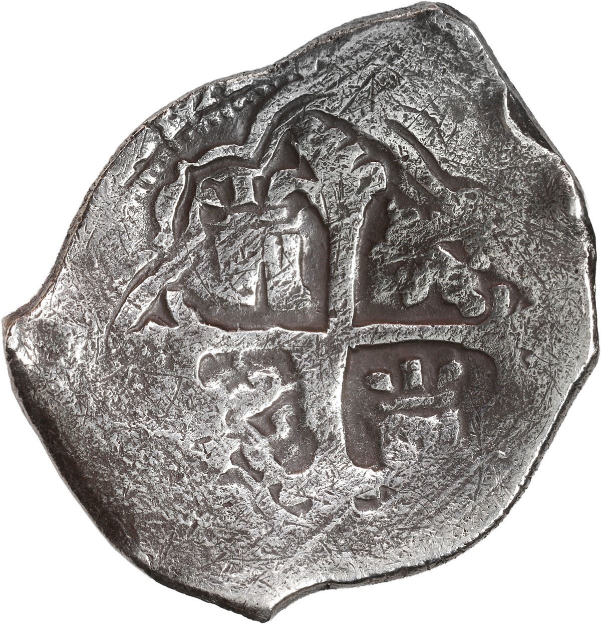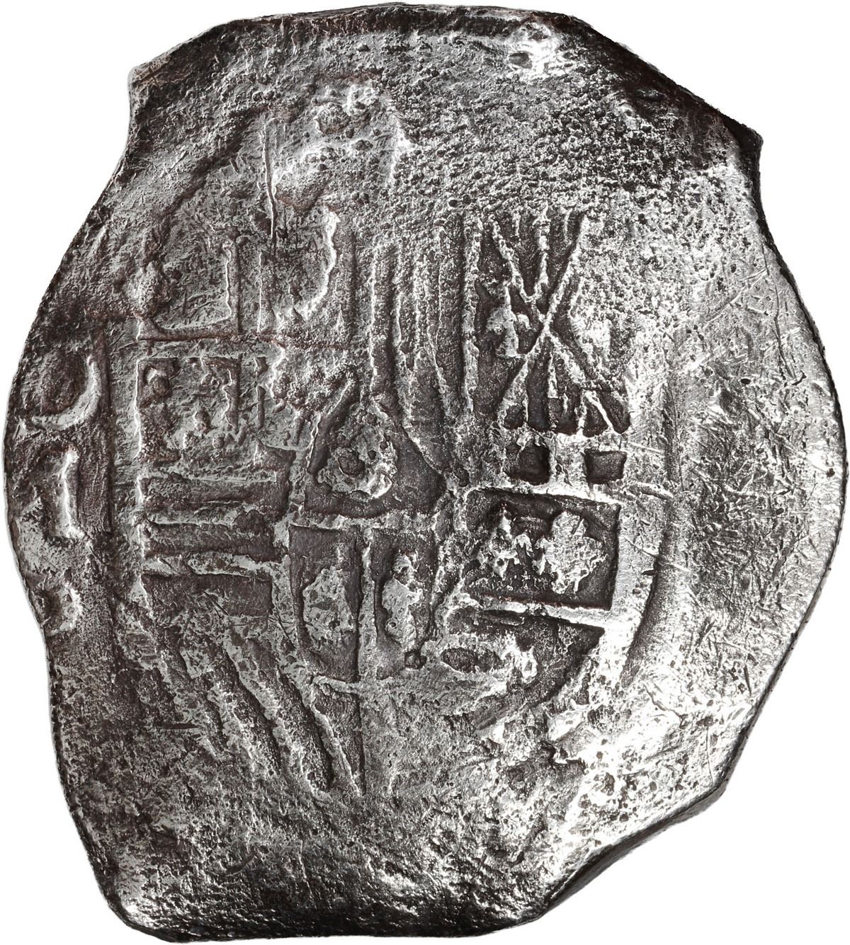 MEXICO, Mexico City, cob 8 reales, Philip IV, assayer D (early 1630s). S-M18a; KM-45; Cal-Type 319. 26.14 grams. Urn-shaped flan with crude full cross exhibiting exaggerated fleur-tips (ca. 1631) yet with later-style shield, bold oMD, surface corrosion, lightly toned. With original certificate from Captain Tracy Bowden through his contract with the Dominican Republic. Recovered from: Concepción, sunk in 1641 off Hispaniola