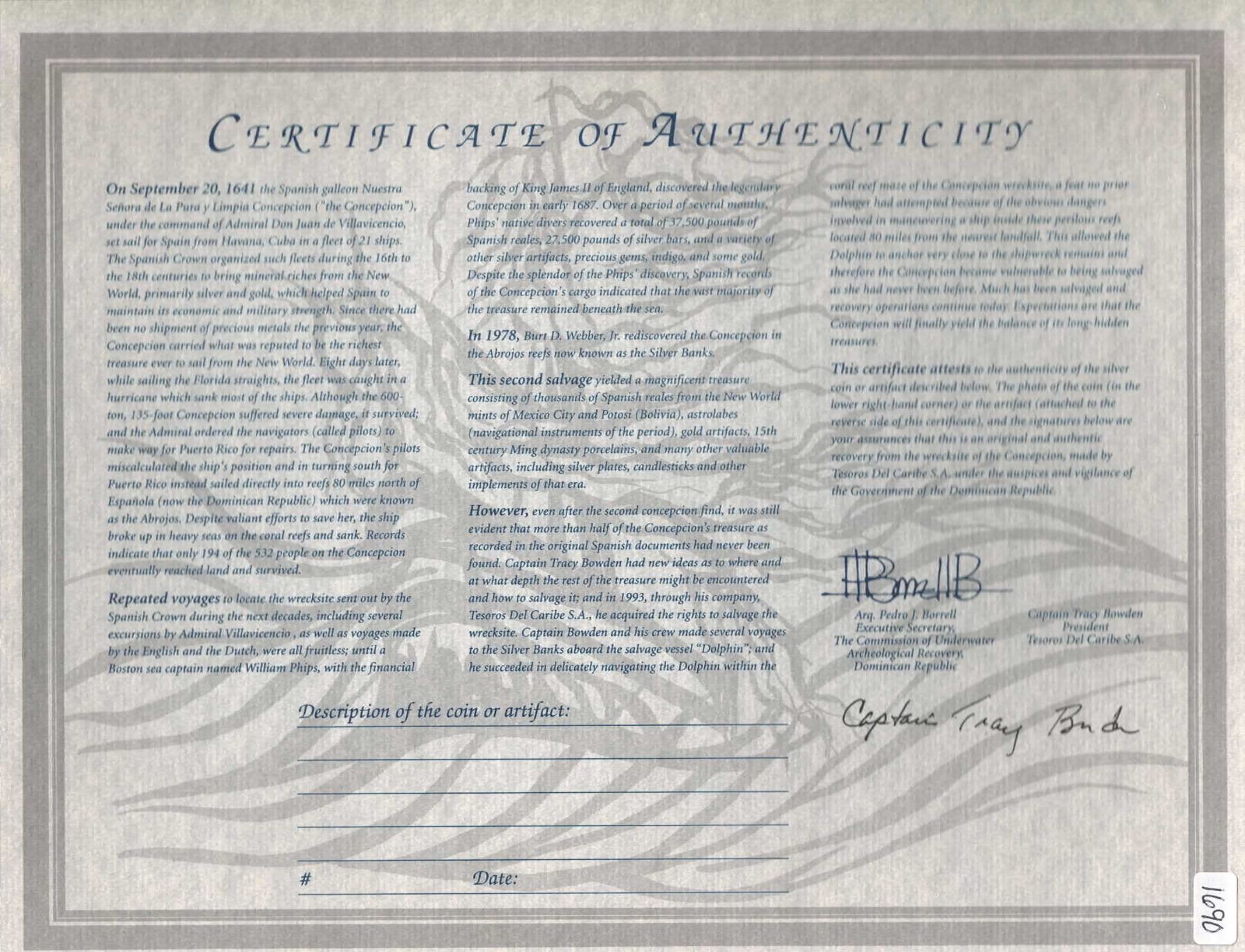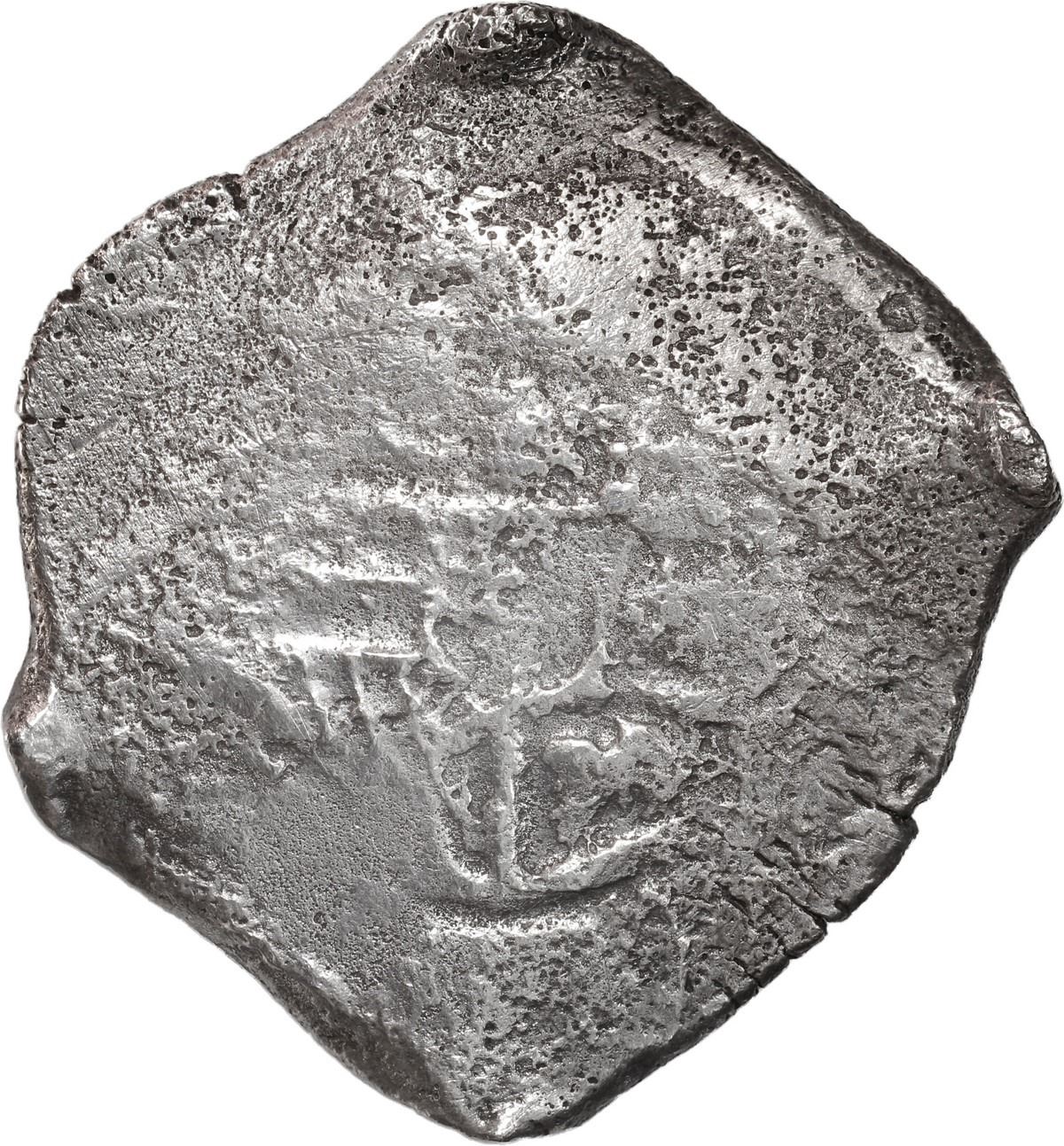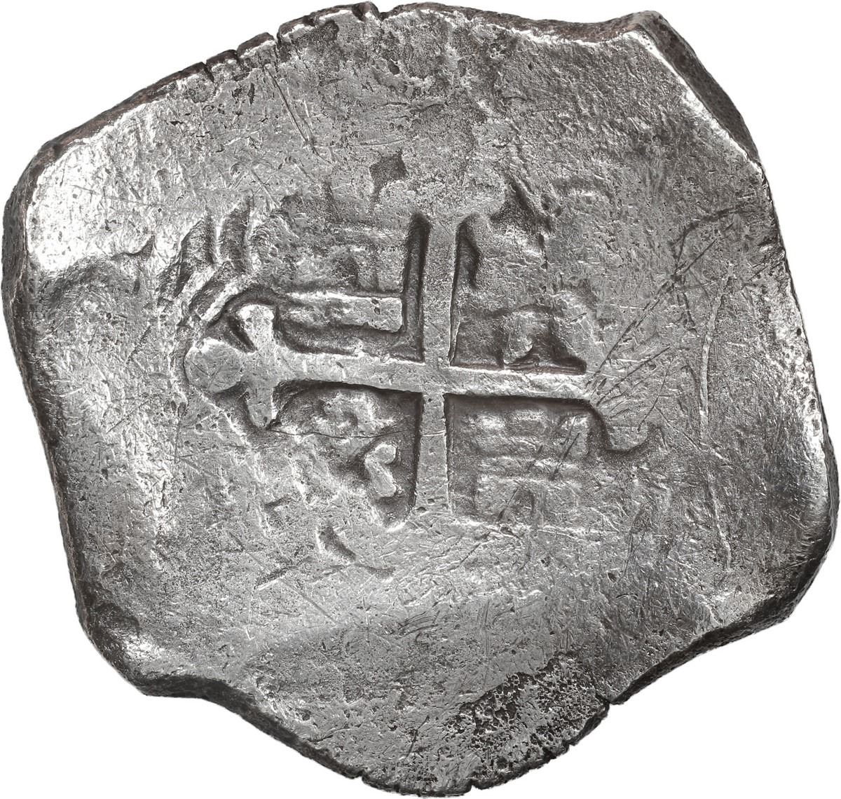 MEXICO, Mexico City, cob 8 reales, Philip IV, assayer D (early 1630s). S-M18a; KM-45; Cal-Type 319. 25.95 grams. Corroded shield side but with a full cross showing off distinctively exaggerated fleur-tips (early 1630s), a few small scratches on the reverse. With original certificate from Captain Tracy Bowden through his contract with the Dominican Republic. Recovered from: Concepción, sunk in 1641 off Hispaniola