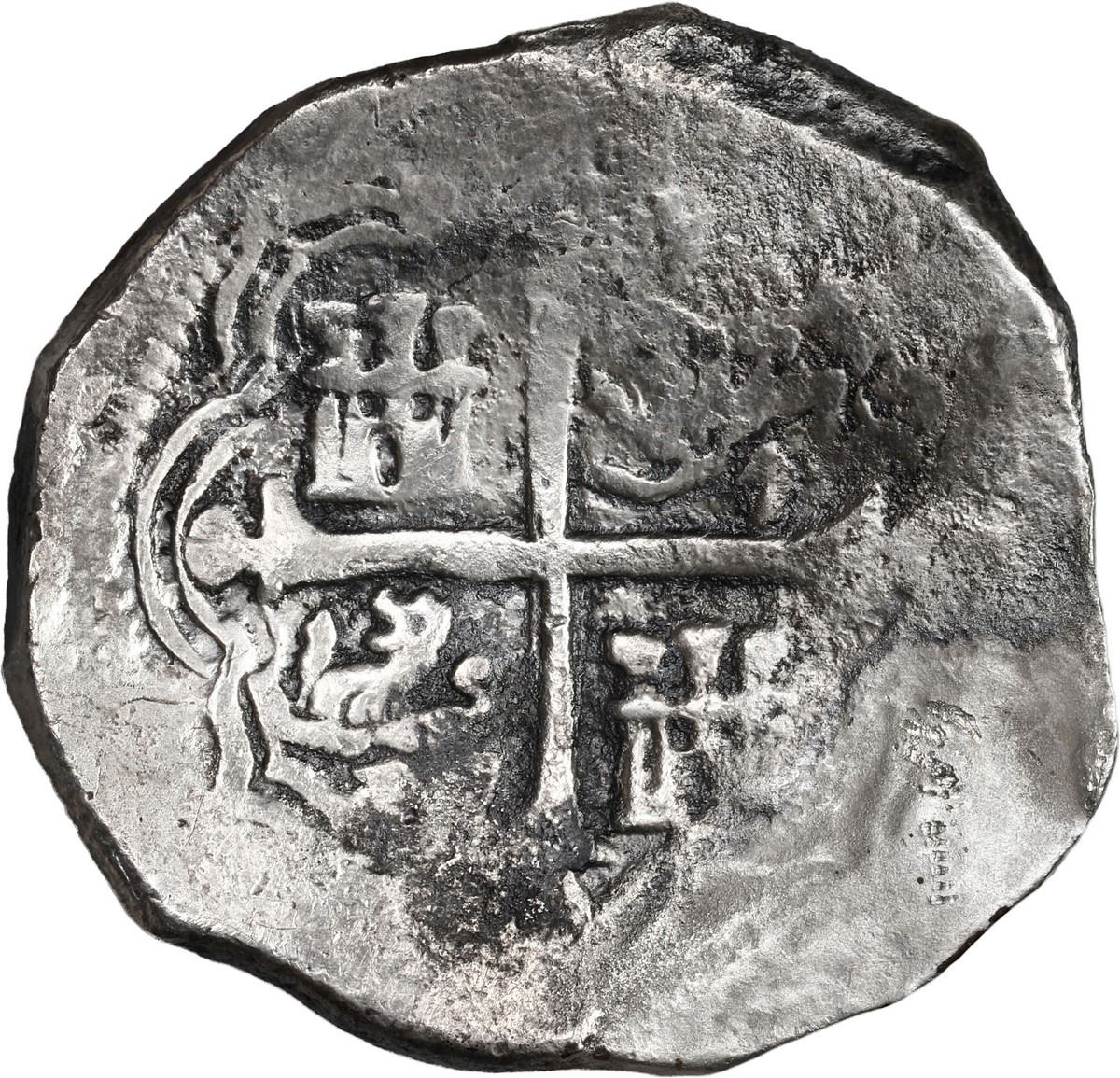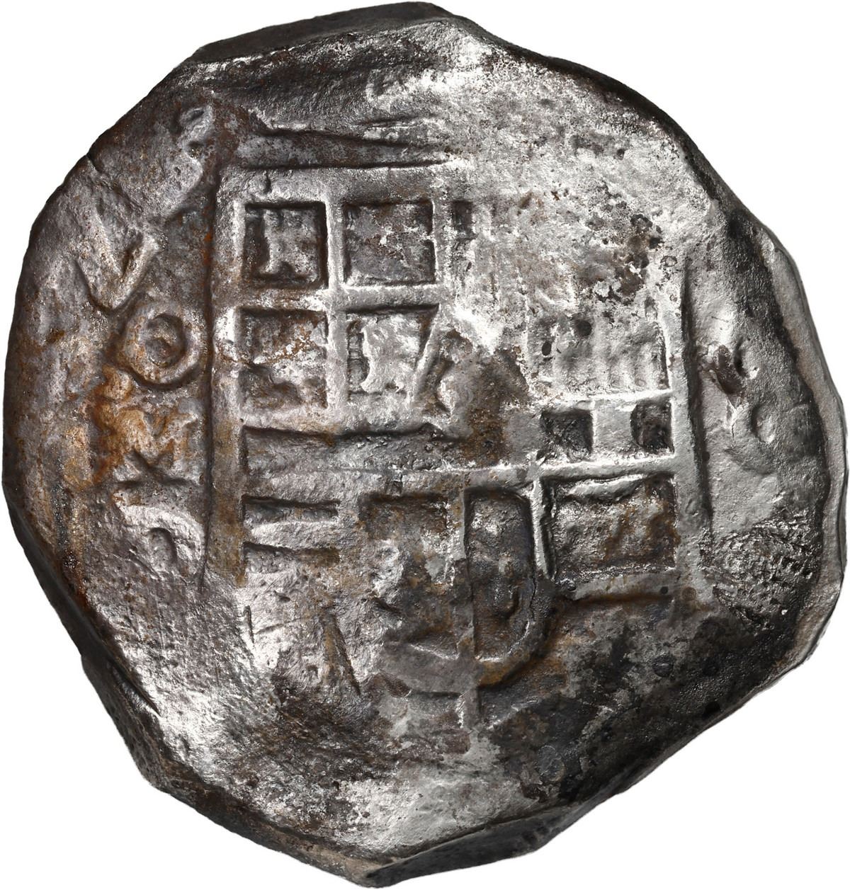 MEXICO, Mexico City, cob 8 reales, Philip IV, assayer D, partial date 162(?). S-M18a; KM-45; Cal-Type 319. 25.34 grams. Clear date with last digit a flat jumble of over-digits above full oMD, nearly full and well-detailed shield and cross, light corrosion, patchy red and black toning, unevenly thick flan. Recovered from: "Lucayan Beach Wreck," sunk ca. 1628 off Grand Bahama Island