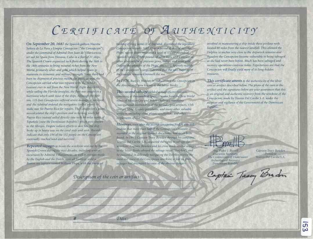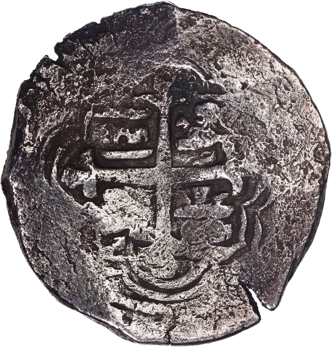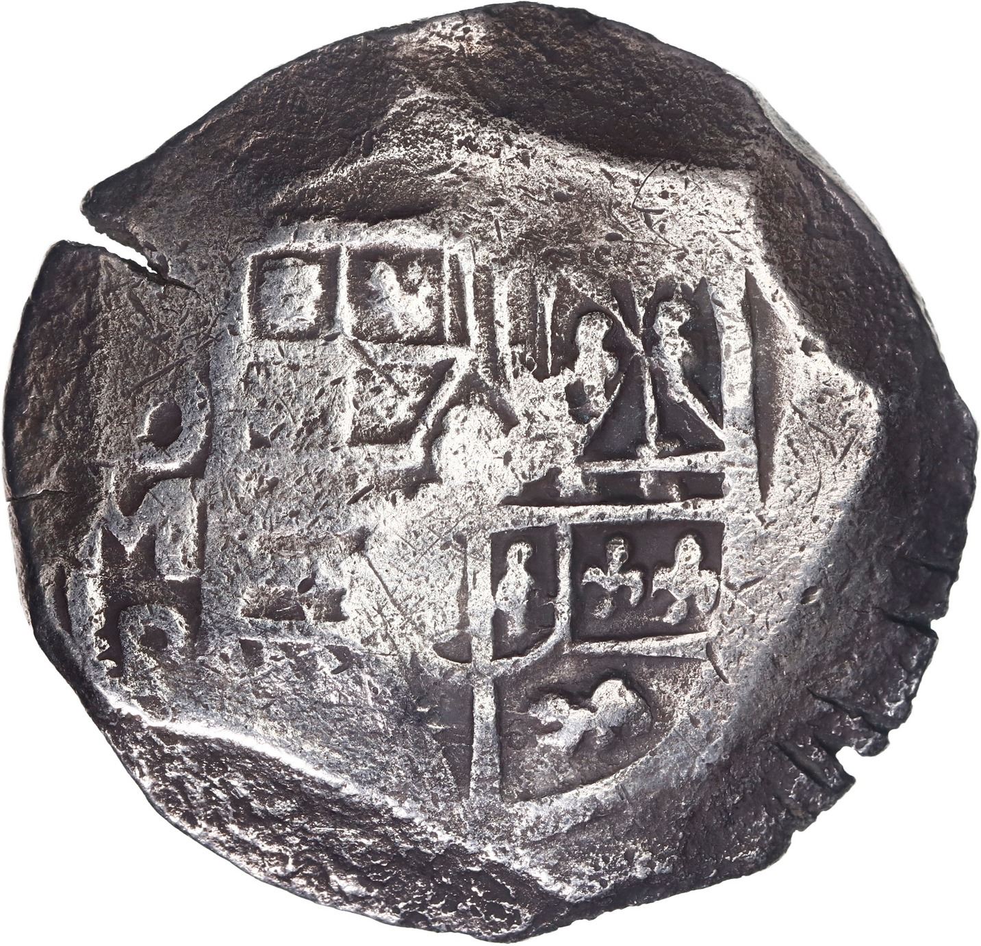 MEXICO, Mexico City, cob 8 reales, Philip IV, assayer D. S-M18a; KM-45; Cal-Type 319. 26.10 grams. Round flan with peripheries typically flat from uneven thickness and beveling (as made), full cross with exaggerated fleur-tips (early 1630s), full shield and oMD, minimal localized surface corrosion, nicely toned. With original certificate from Captain Tracy Bowden through his contract with the Dominican Republic. Recovered from: Concepción, sunk in 1641 off Hispaniola