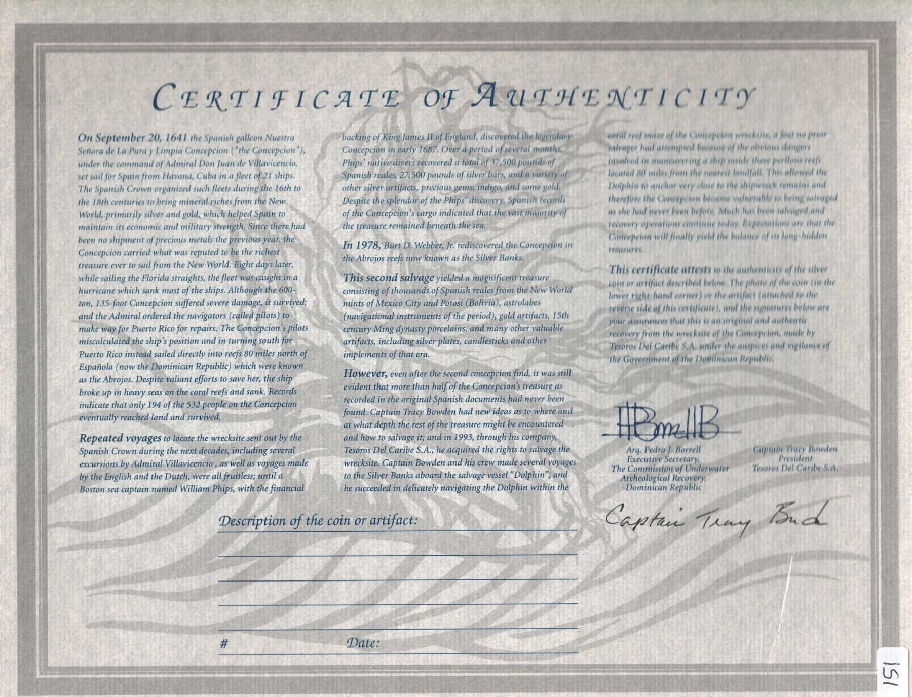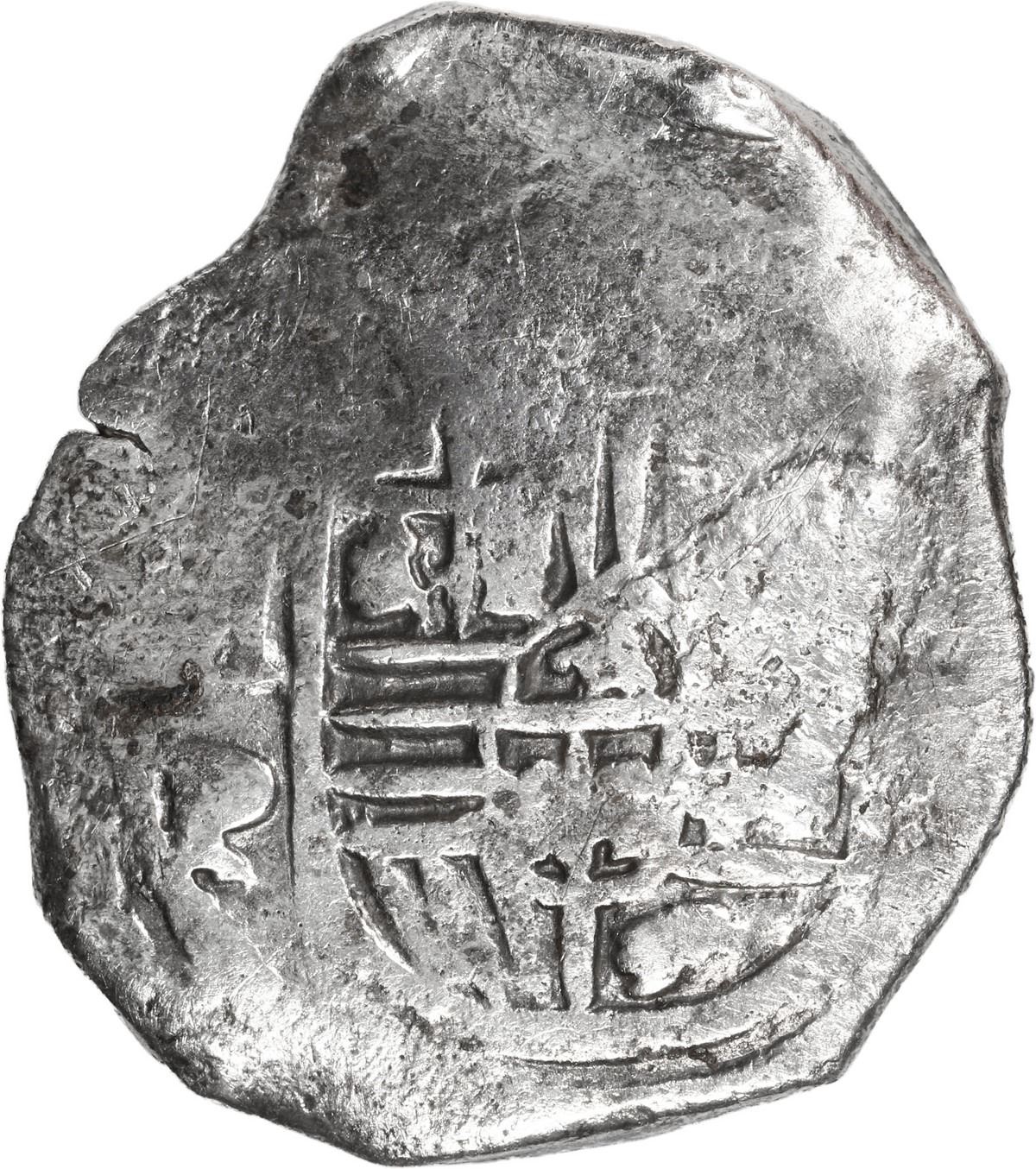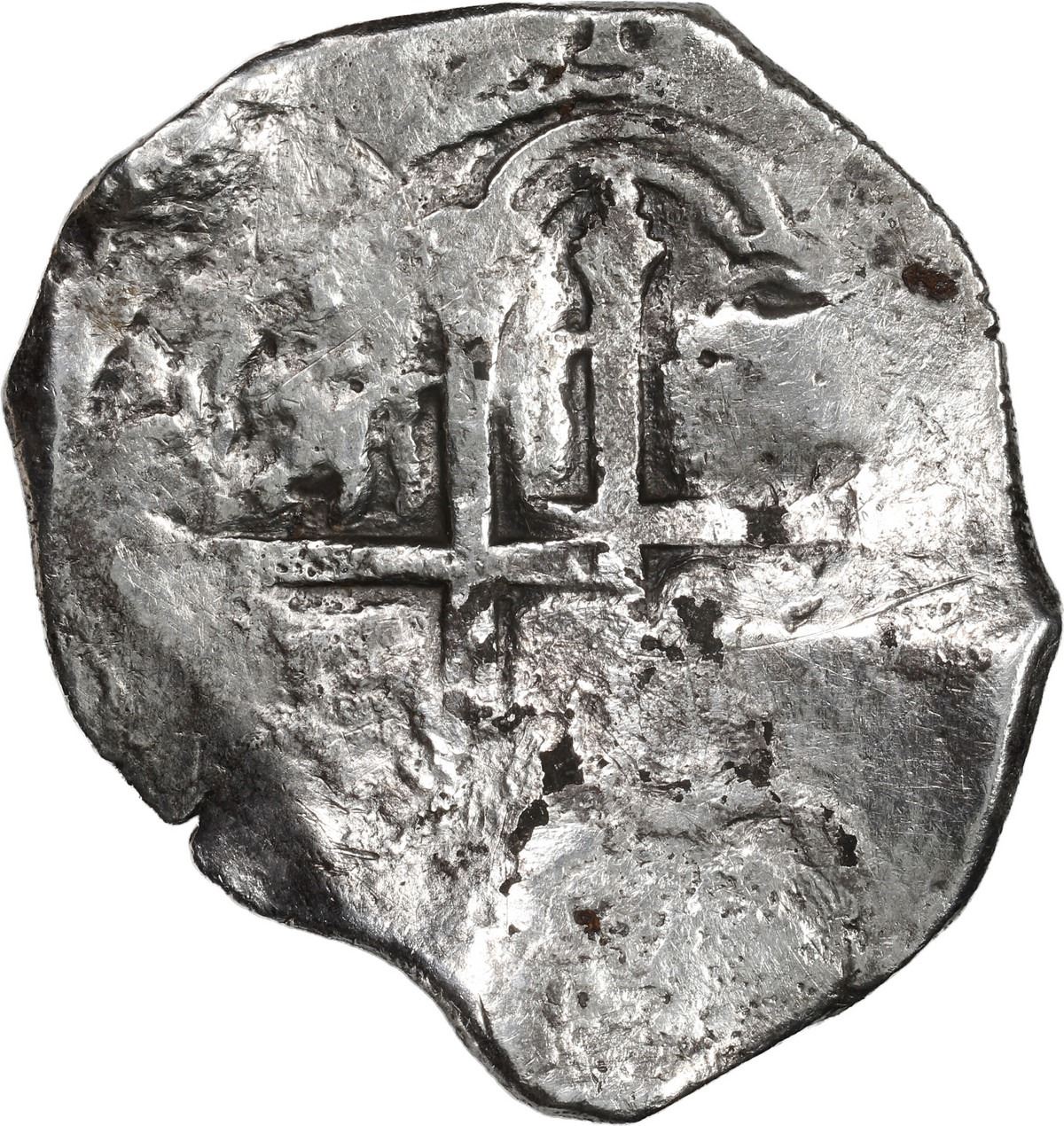 MEXICO, Mexico City, cob 8 reales, Philip IV, assayer P, double-struck cross. S-M19; KM-45; Cal-Type 319. 25.32 grams. Bold assayer, unevenly thick and peripherally flat but minimally corroded, with most of shield and cross, the latter with well-shifted double-strike (scarce), lightly toned. With original certificate from Captain Tracy Bowden through his contract with the Dominican Republic. Recovered from: Concepción, sunk in 1641 off Hispaniola