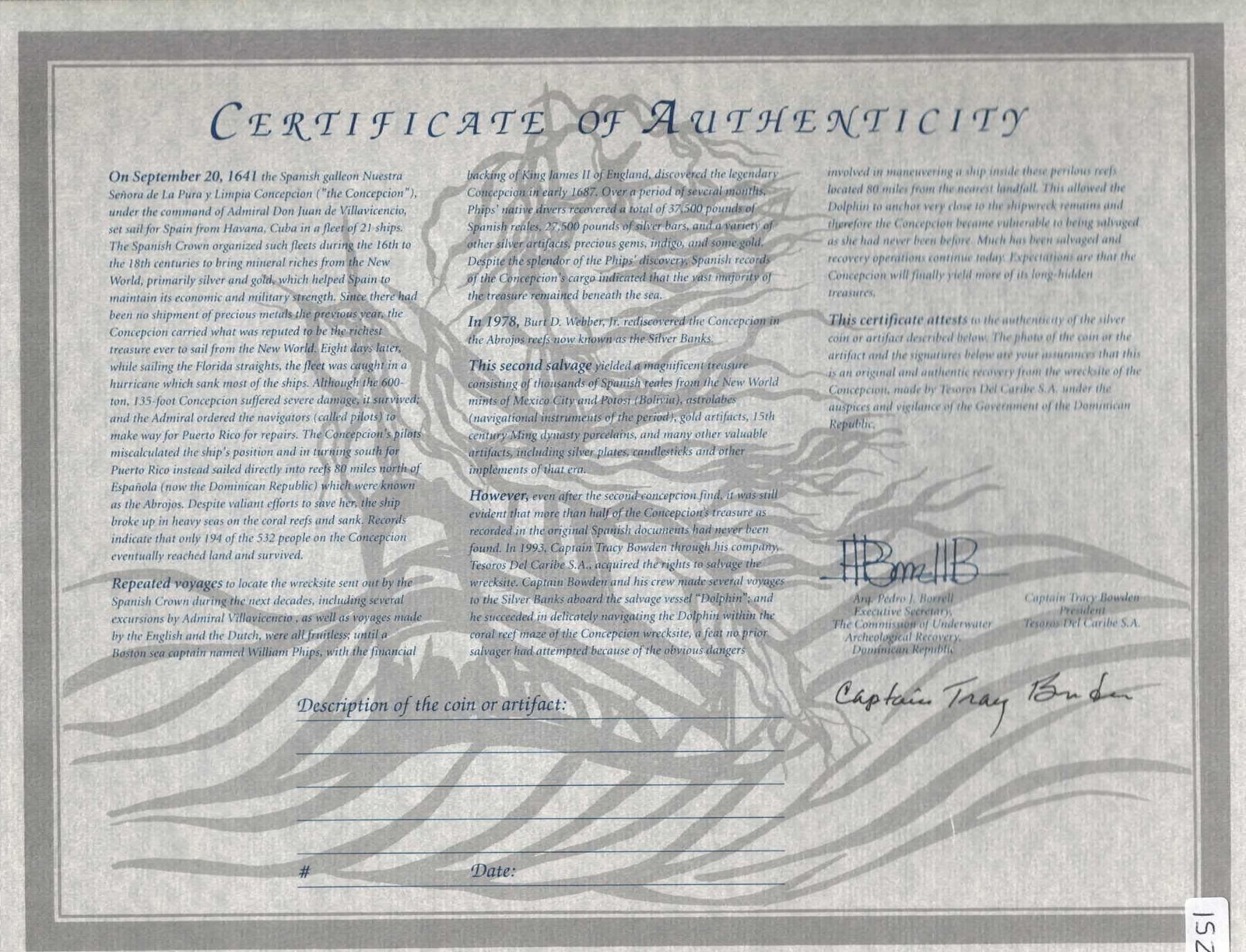MEXICO, Mexico City, cob 8 reales, Philip IV, assayer P, double-struck cross. S-M19; KM-45; Cal-Type 319. 26.60 grams. Broad, roundish flan with a couple blunted points on edge (as made), clear oMP and 8 flanking full shield, full cross with slightly shifted double-strike (scarce), lightly toned, no corrosion. With original certificate from Captain Tracy Bowden through his contract with the Dominican Republic. Recovered from: Concepción, sunk in 1641 off Hispaniola