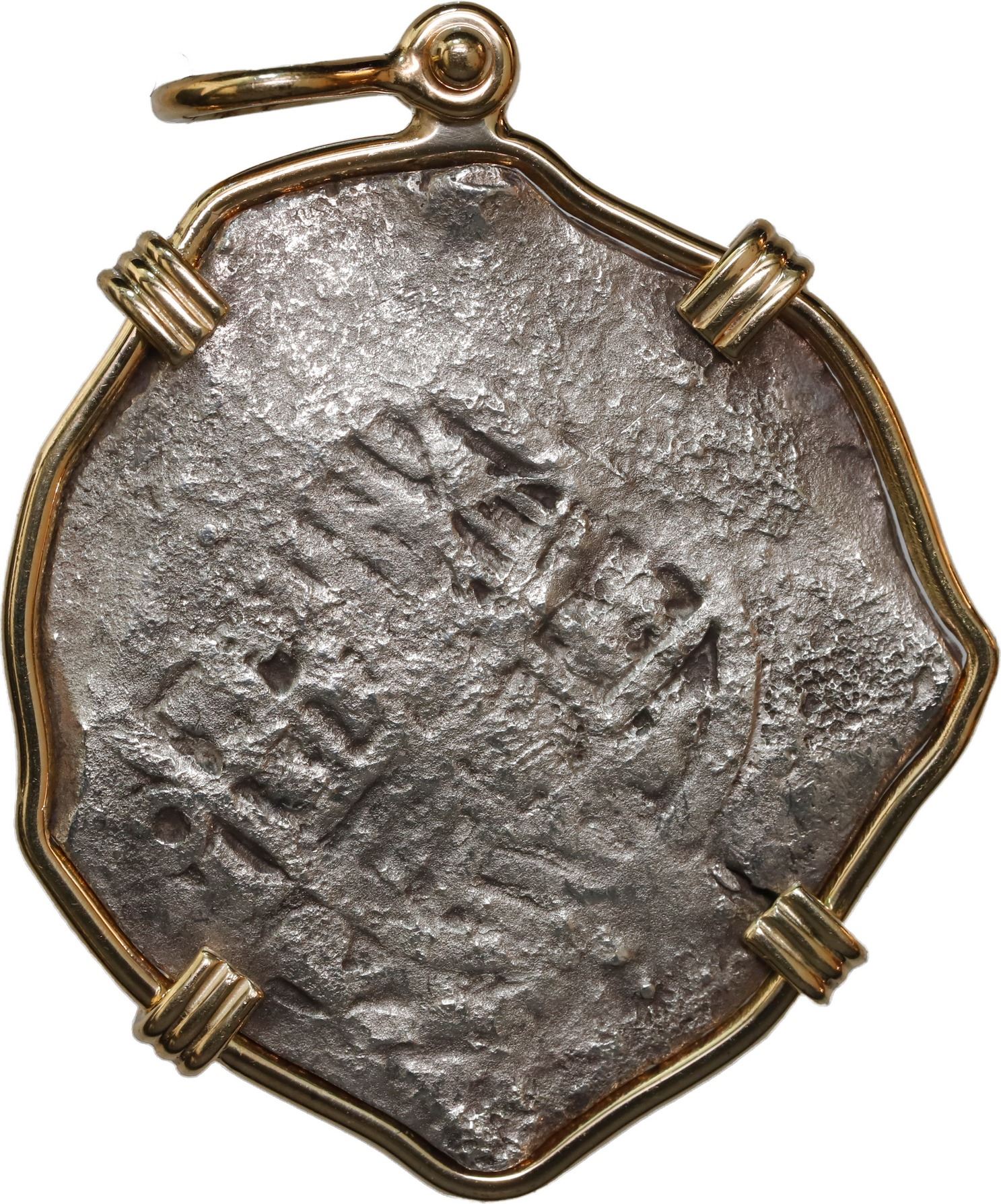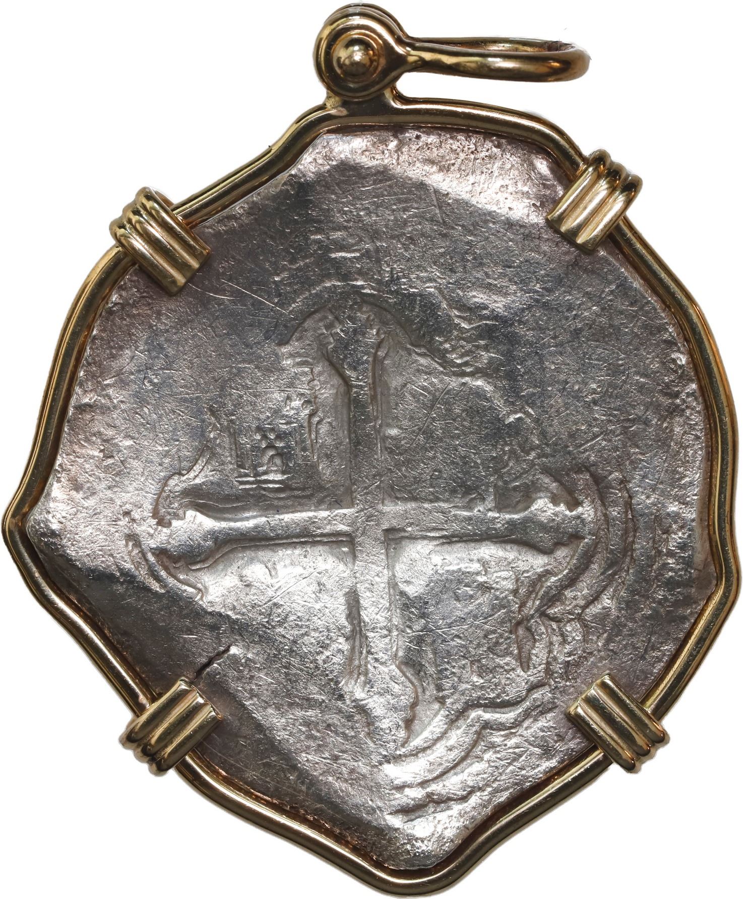 MEXICO, Mexico City, cob 8 reales, Philip IV, assayer P, ex-Concepción (1641), mounted cross-side out in 14K gold pendant with shackle bail. 31.44 grams total. Solid, broadly struck piece with nice full cross without any corrosion, bold partial shield amid moderate corrosion though with clear mintmark and assayer. From the Concepción (1641), with original certificate from Captain Tracy Bowden through his contract with the Dominican Republic.