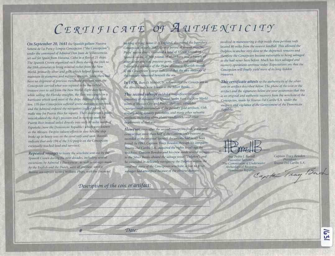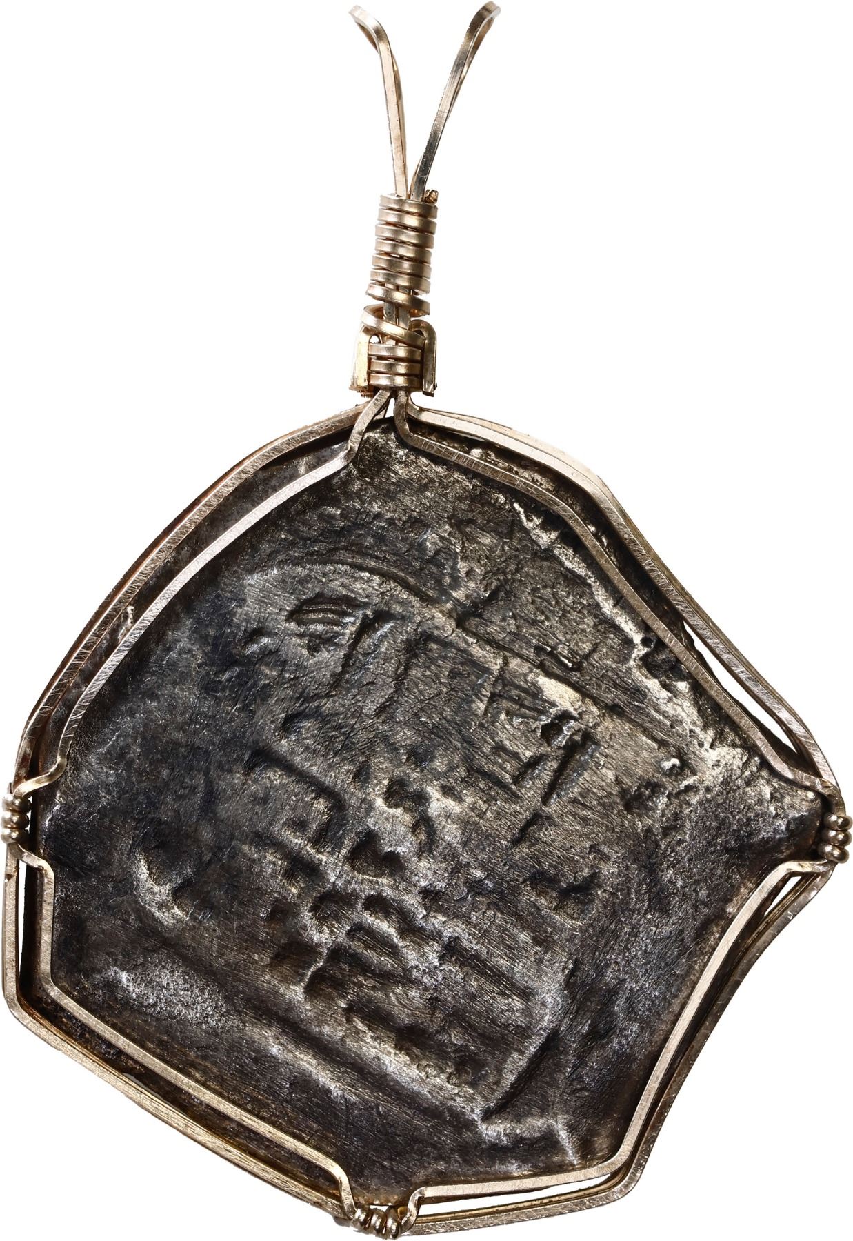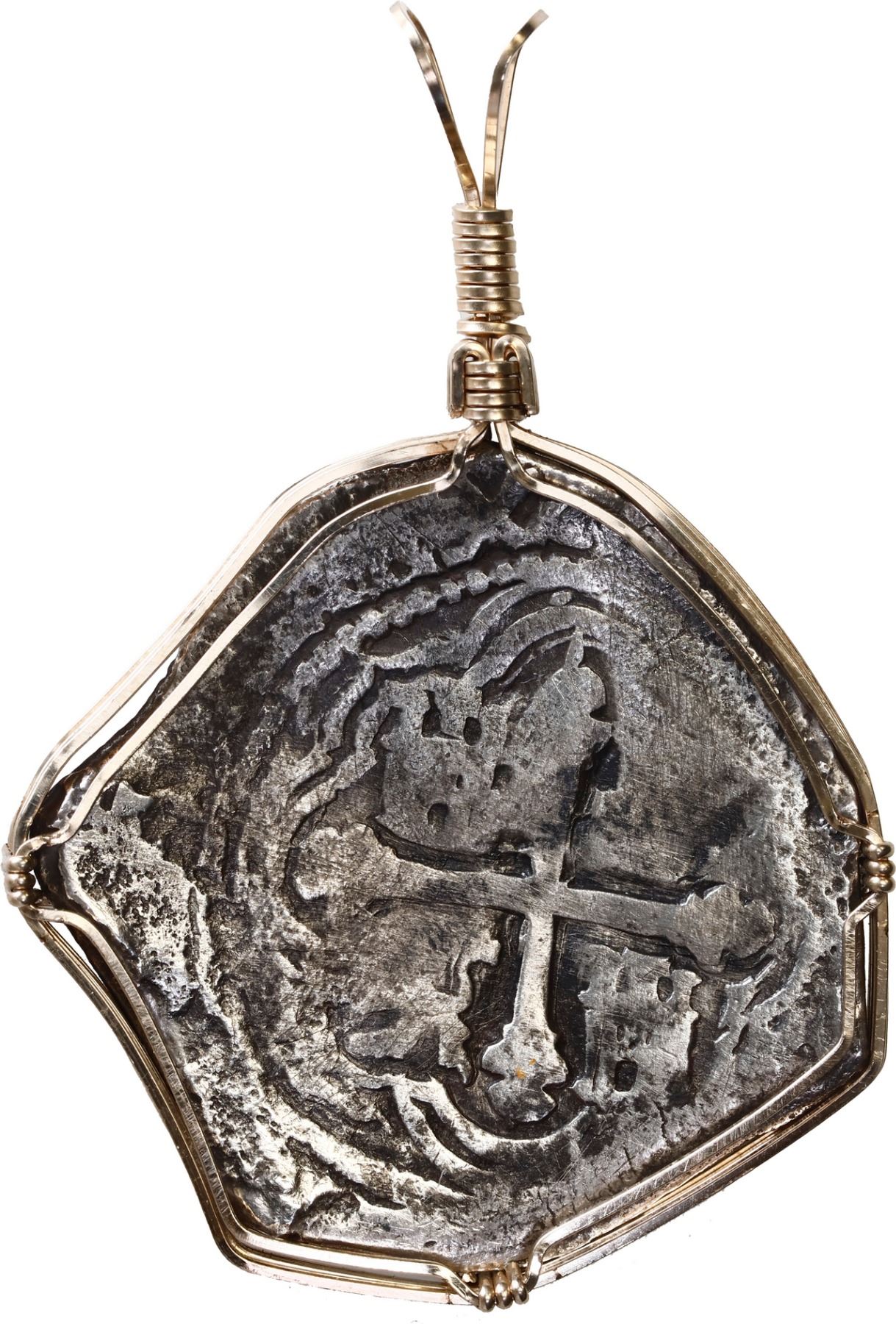 MEXICO, Mexico City, cob 8 reales, Philip IV, assayer P, ex-Concepción (1641), mounted cross-side out in 14K gold-wire pendant. 25.42 grams total. Nice full cross with grayish silver toning, nearly complete yet weak shield though with clear assayer to left, minor surface corrosion throughout. From the Concepción (1641), with original certificate from Captain Tracy Bowden through his contract with the Dominican Republic.